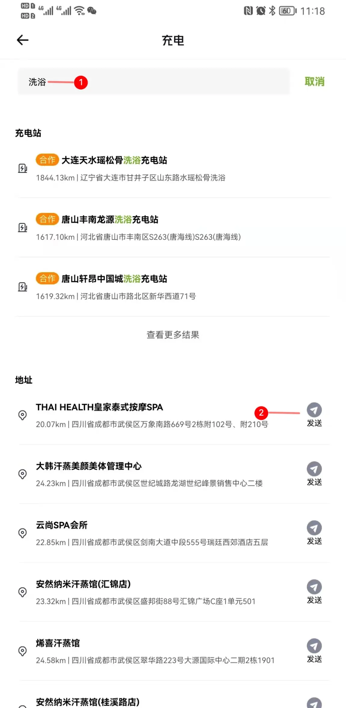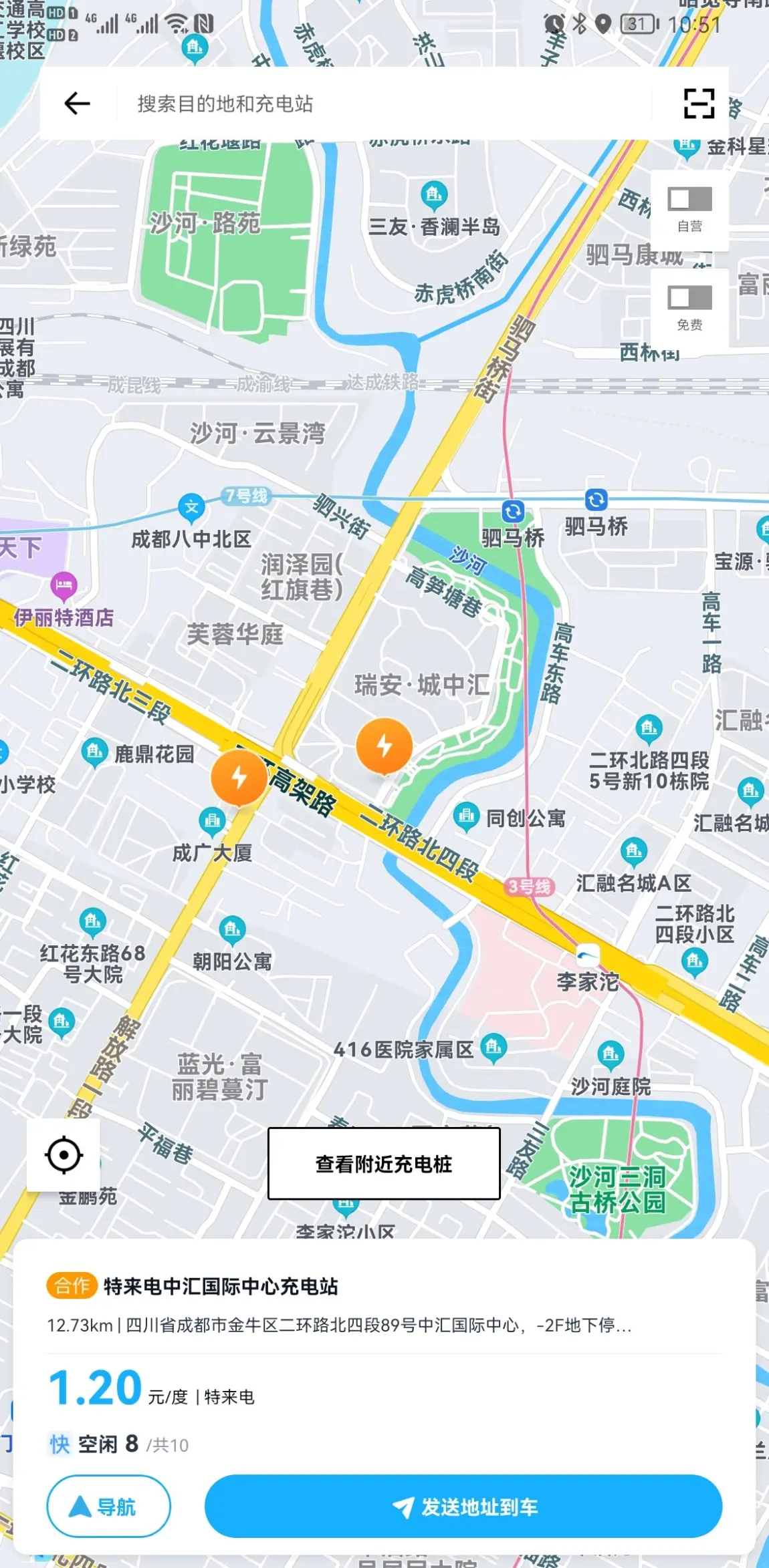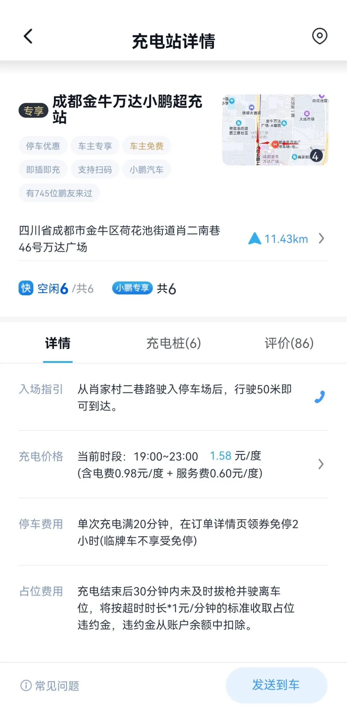 看到一个免费充电站,准备前去喝两口,在充电站详情页面,直接点击发送到车即可。