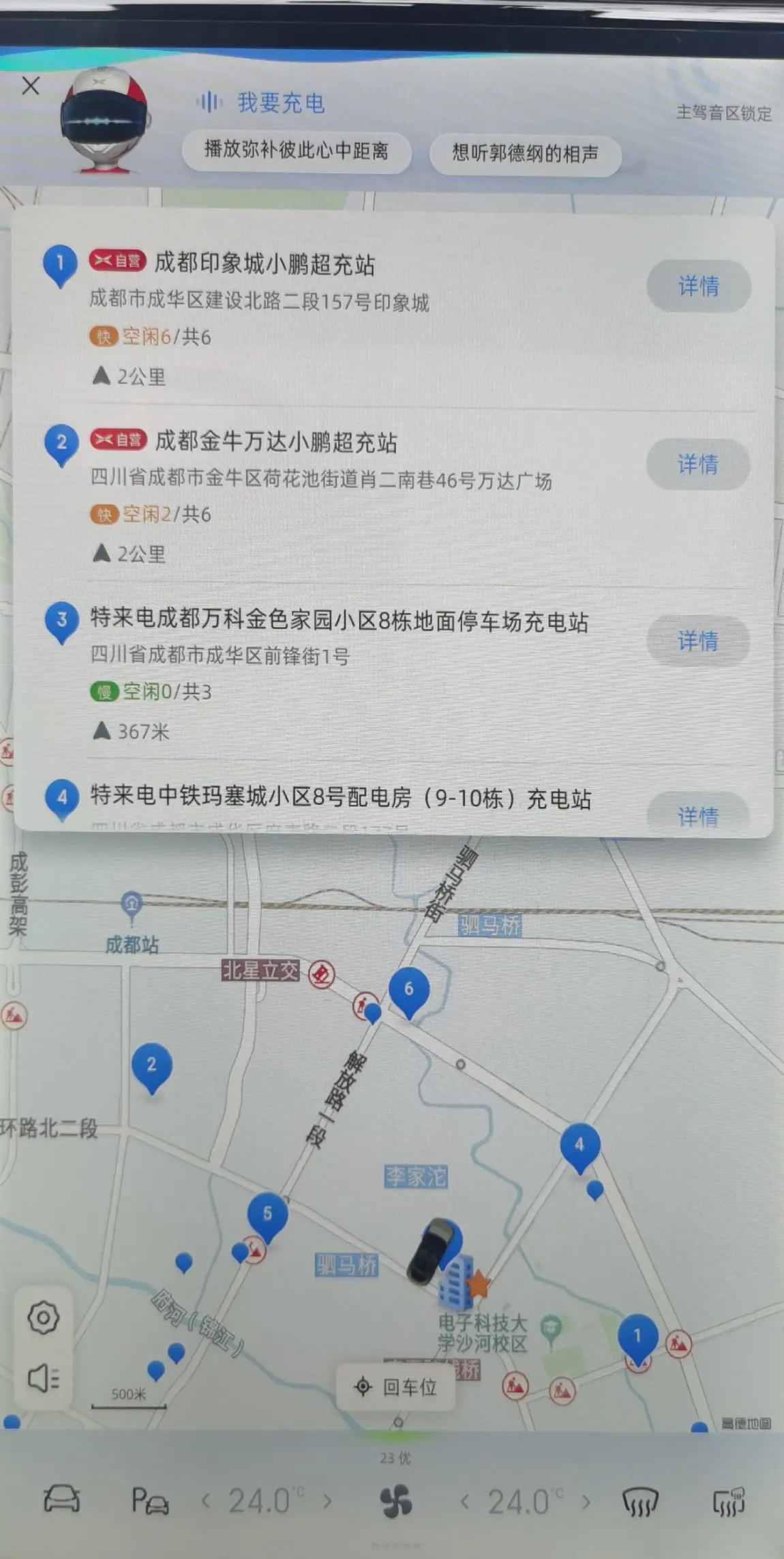 在行驶过程中发现电量不足,想去充点电,直接对小p说:“我要充电”,小p就会搜索出来附近的充电站,然后选择要去第几个就可以了。