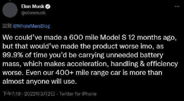 今天看到马斯克发文,他认为续航里程过高没意义,携带额外重量的电池会使得加速、操控等性能变差,你认同吗?