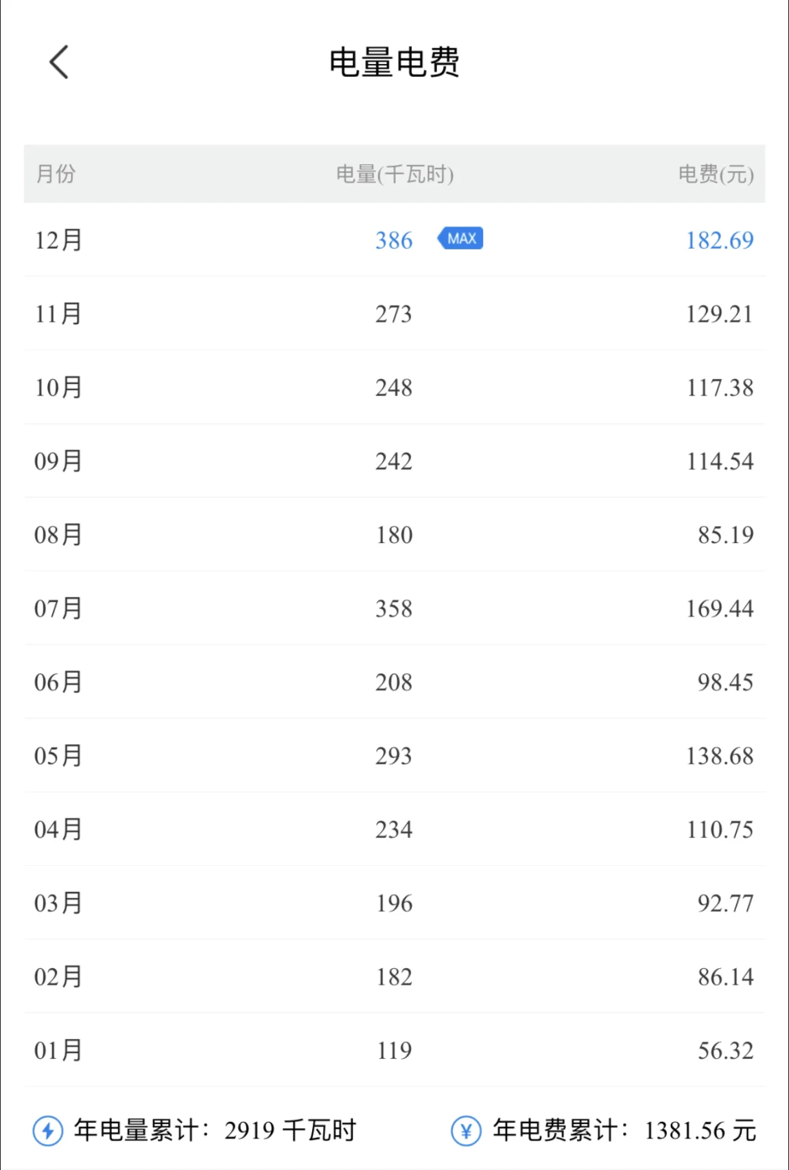 ✨2021年3月至12月共使用2618kwh,花费1239.1元。