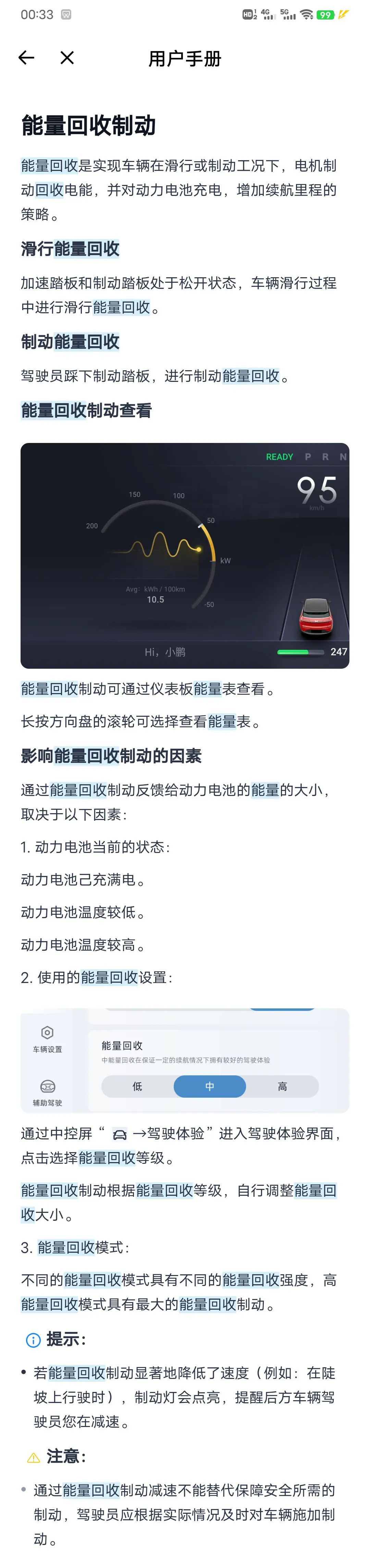 💡对于没开过油车的新鹏友,则推荐能量回收等级设置为中或高,因为制动更明显。一样不推荐一上来就设置运动模式,理由同上。