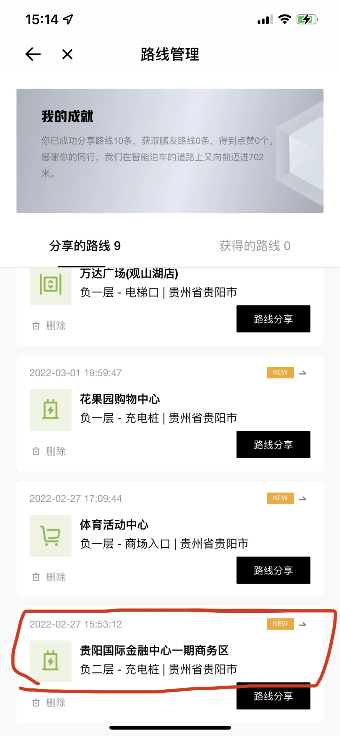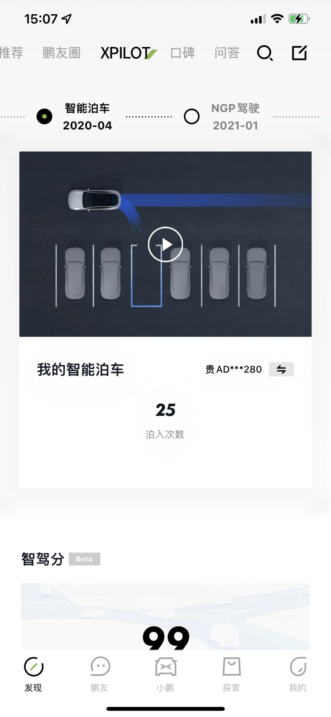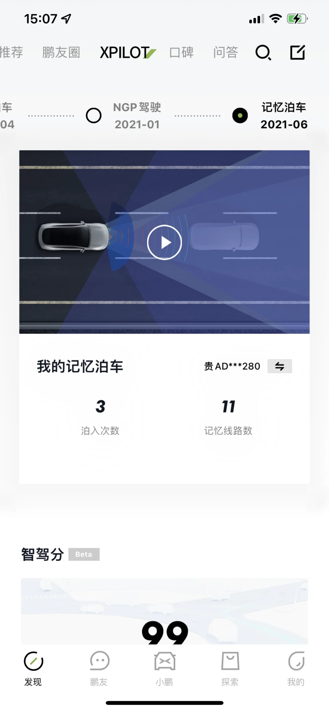 记忆泊车功能用了3次停车。记忆了11条常去的路线,除了夸楼层不能享受到,其他正常使用,也很方便。每次进入到记忆过的停车场,达到以后,车机屏幕就会自动弹出记忆泊车可用。点击,就可以自动驾驶过去。经常用到的就是咱们贵阳金融城的小鹏超充站。