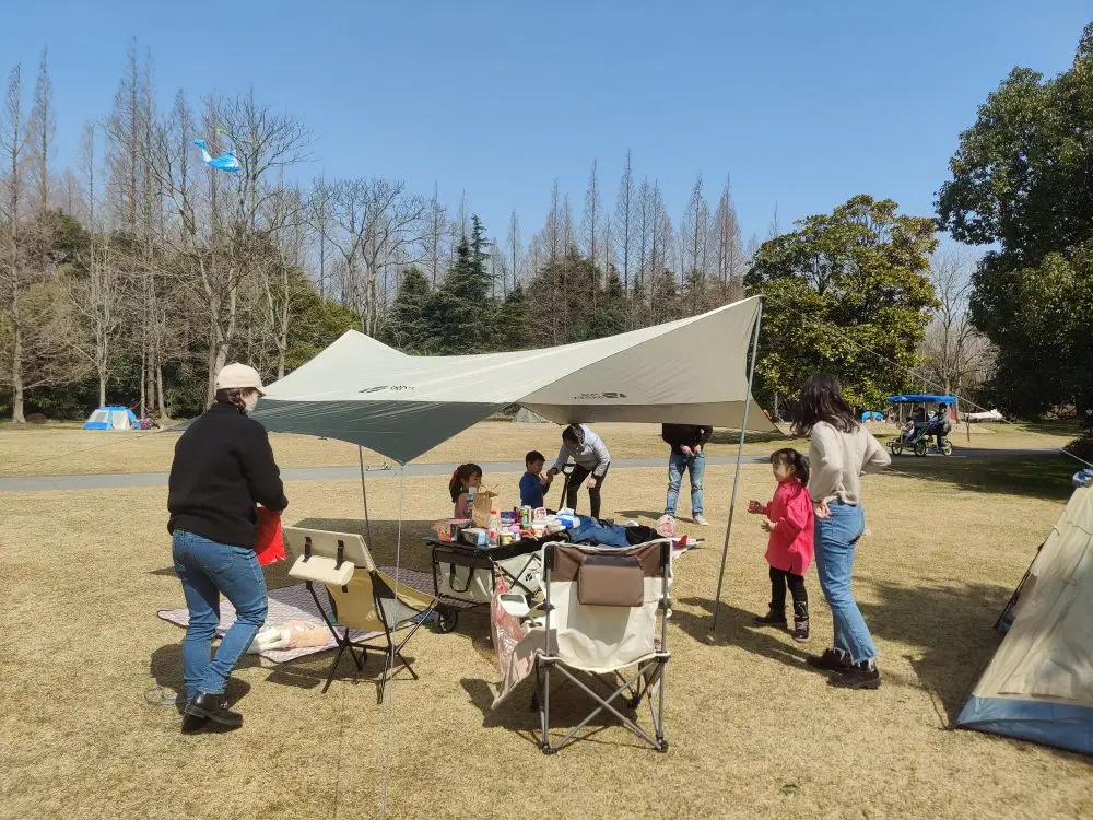 然后就是天幕啦,这个对于新手来说不算必备品,主要适合阳光比较大的时候使用,防晒遮阳,可能出片拍照也更好。选带涂银隔热防晒的即可,我选的牧高笛天幕,4米那款,如果平时主要是家庭使用,选4米即可,肯定够用了。价格一般在200左可以搞定。