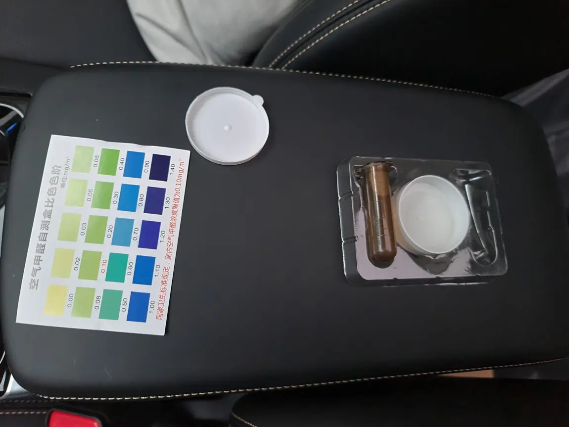 第二天,倒进测试液,测试结果出来了,惊喜地发现,车内甲醛浓度大概只有0.06mg/m²距离超标限值0.10 mg/m²还有两个0.04的差距,这证明小鹏汽车的甲醛浓度确实控制得挺好,车身内式,座椅皮都是符合标准的正规材质,顿时放下心头大石。
