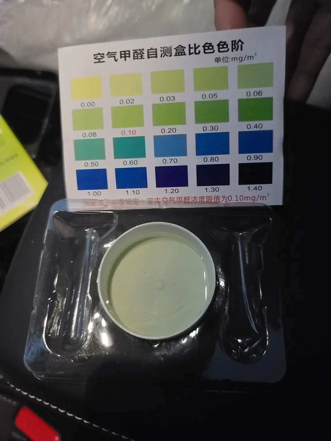 调好测试剂,在车里密闭空间放置了一个晚上,实际30分钟就可以检测出来了,谨慎起见还是等它吸收了一整晚车内空气,让检测液充分吸收甲醛。