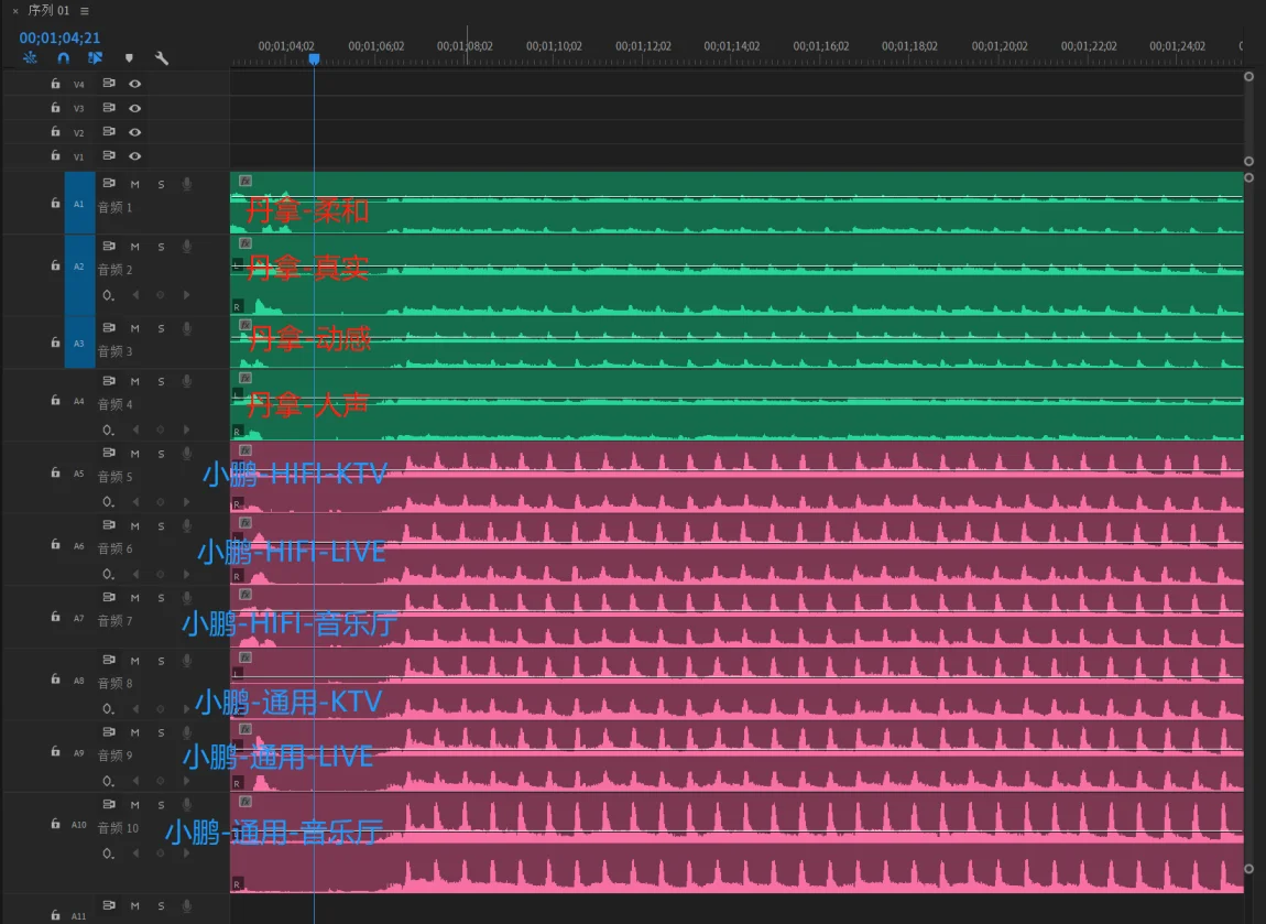 我把每一次的录音拖进音频处理软件,想通过对比音频的波形来进一步了解不同的音效之间究竟有什么区别.