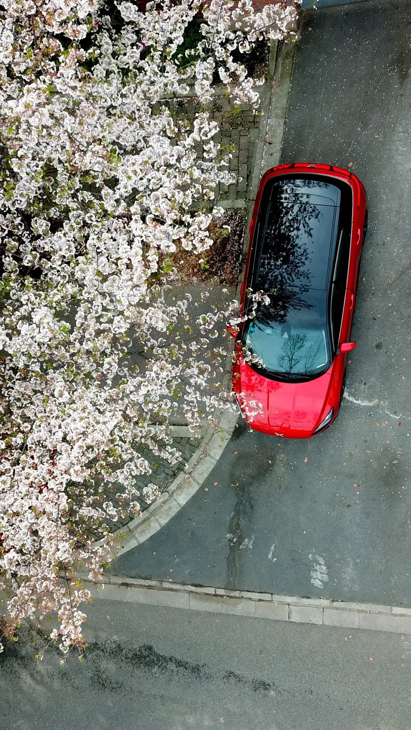 暖风微醺,树影婆娑,红车白樱,便是人间醉美。