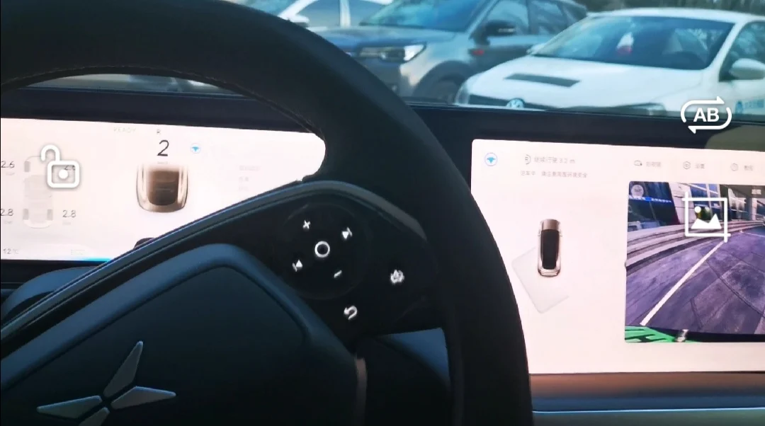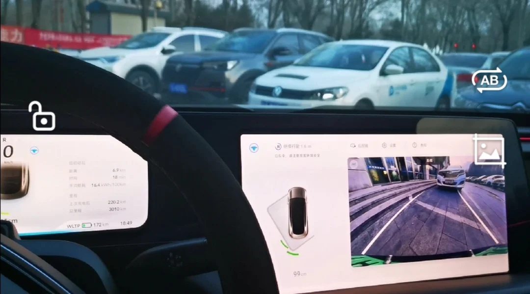 这个时候会出现360界面,发现车位后点击我要智能泊车,然后挂入倒车R档,踩住刹车打开autohold,松开刹车,自动泊车开始。