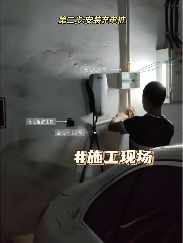 2⃣️第二步线路搞定后就等着上门安装充电桩本体了,小鹏的安装需要在APP里申请,第三方安装公司会来联系,没有布线工程的话2小时左右搞定,完成后会进行充电测试,车还没到也不要紧,有测试工具,最后师傅会提供工单尾号用小鹏app激活充电桩,over。