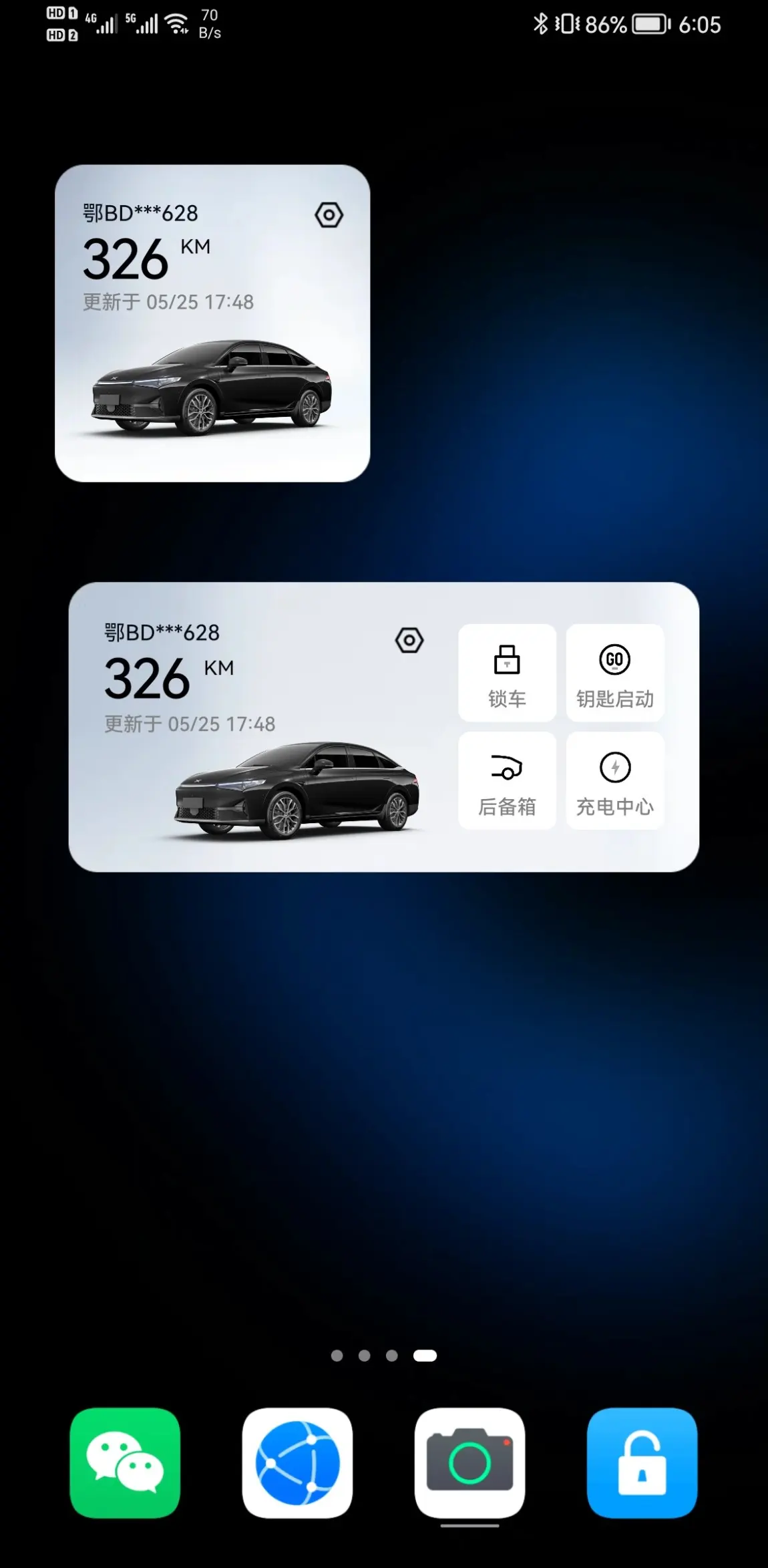 目前可以实现直通:锁车、解锁、一键通风、一键关窗、极速升温、极速降温、鸣笛、闪灯、钥匙启动、后备箱、充电中心等11项功能,可以说是非常的全面!可以通过更改来自定义主要使用的4个快捷功能。楼主最多使用的锁车、钥匙启动(这个和解锁的区别在于前者可以解锁并启动车辆,后者只能解锁车门车辆不上电)、后备箱和充电中心(方便在车辆充电的时候查看进度)。