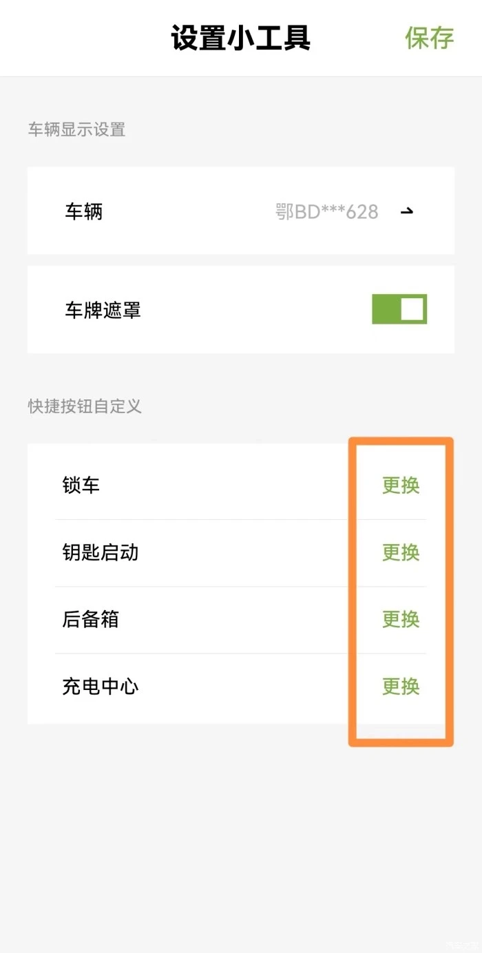 个组建除了显示车牌和剩余里程基本信息外,还有四个快捷键,可以点击“设置”(螺纹按钮)自定义功能。