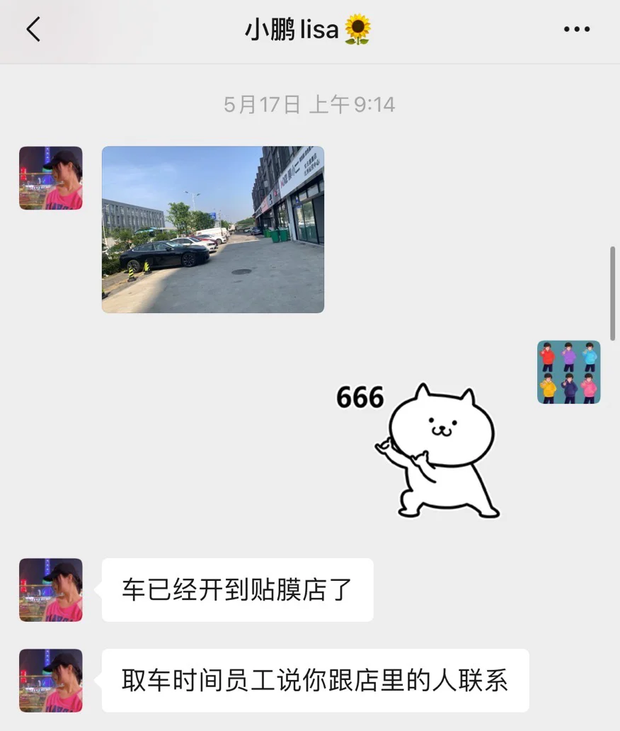 1.在这我不得不再夸一次小鹏青山湖服务中心交付小姐姐Lisa,我提车第二天(第一天很晚在店内安装电尾门),帮我亲自开往贴膜店,并拍照交接。