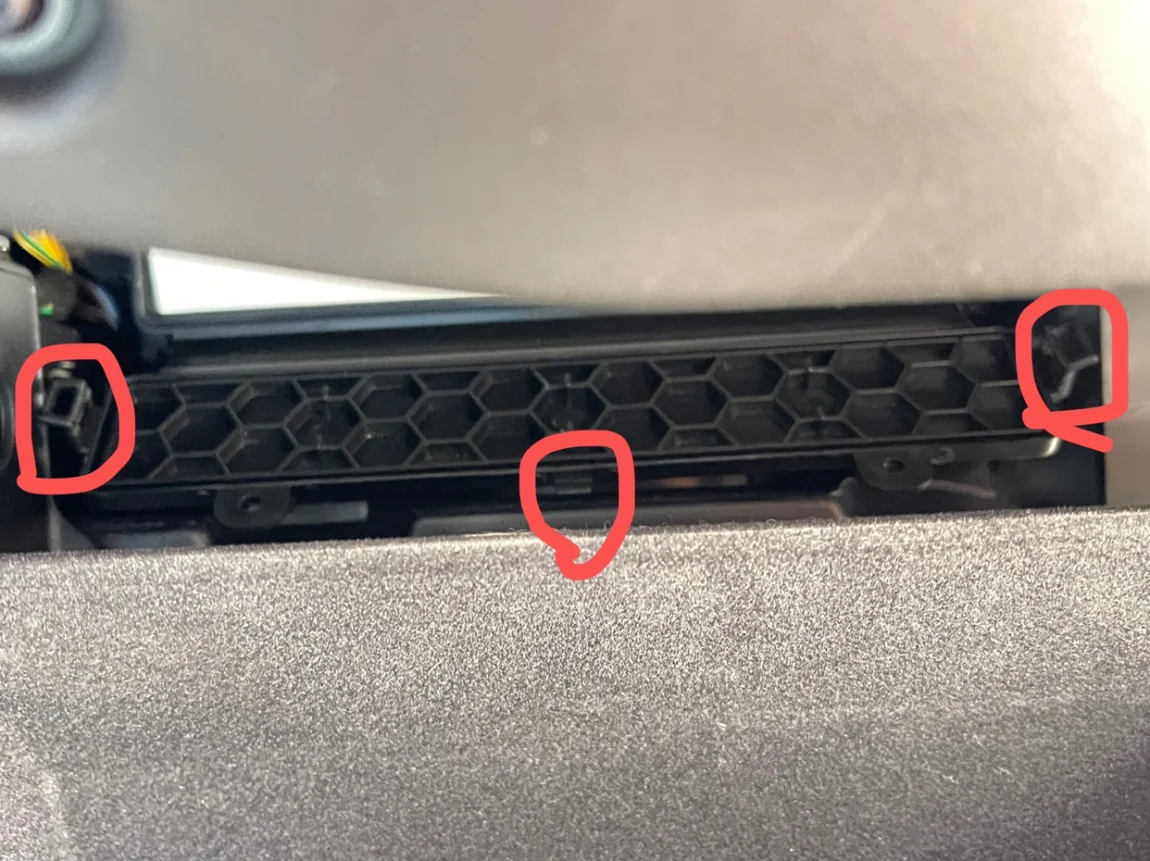 ⭐空调滤芯盖板也是三个卡扣,上方中间一个卡扣,两边各一个卡扣,我们最好双手申请一起扒开卡扣(缝隙还是有点小,一定要摸到卡扣的位置然后扒开,不要硬扒。)