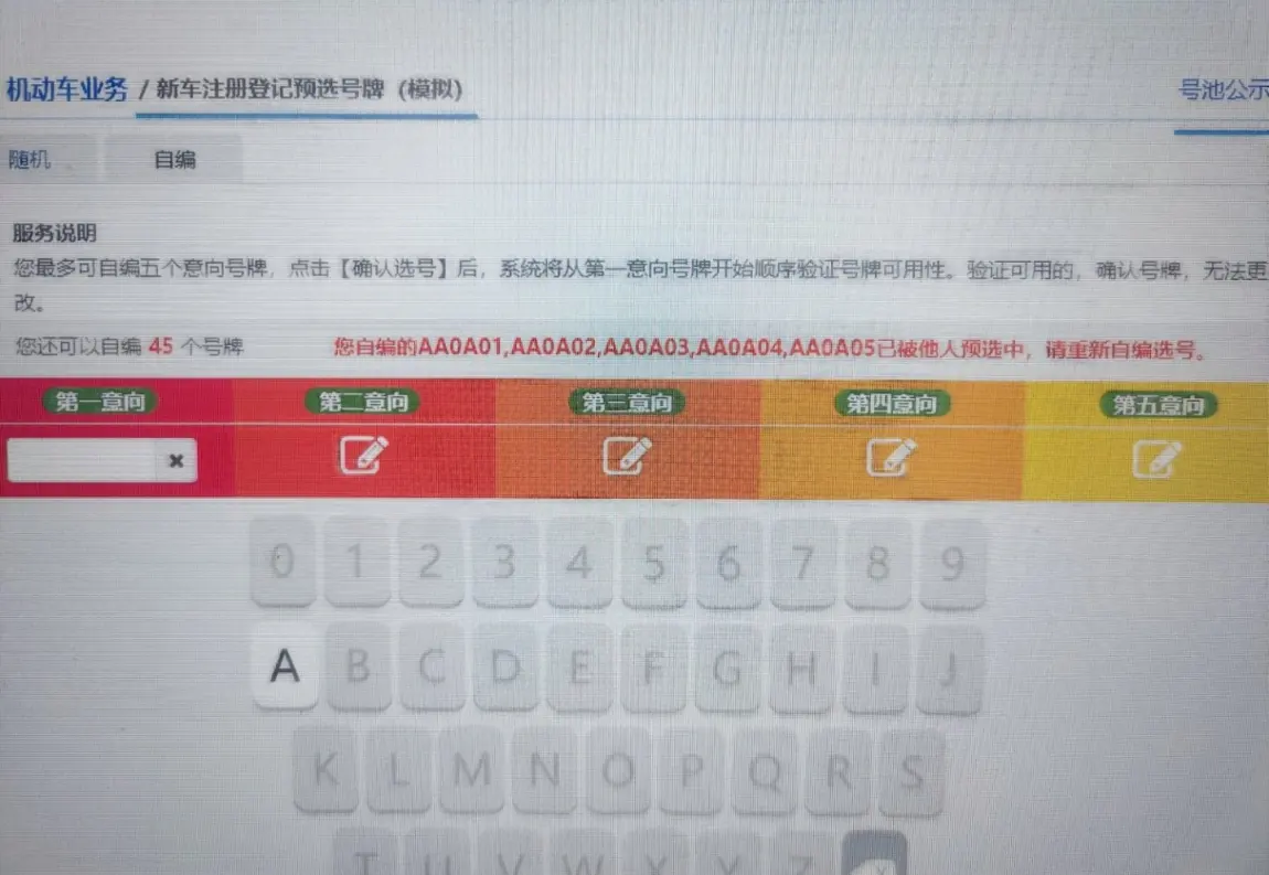 先自编,总共可以自编50个,其实自编的号码大多数都没有,我就是编了30多个后,疑惑了,质疑了,胡乱编了一个带4的就成了,随机都没有让我选,直接给号码了…欲哭无泪😱😱😱。总之,⭐想要的自编号牌没有的话,宁缺毋滥,而且一定要记住,最喜欢的一定要排在自选号第一位!按照顺序来确定号码的,切记!⭐