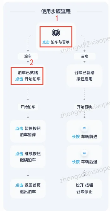 长按泊车与召唤按钮,等待车辆进入准备状态,等到车上收起后视镜及双闪后,就可以点击开始泊车按钮,这个时候系统开始泊车,如需中断,点击暂停即可,恢复就点击继续泊车按钮