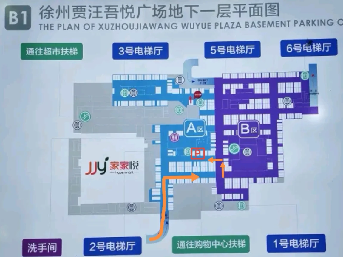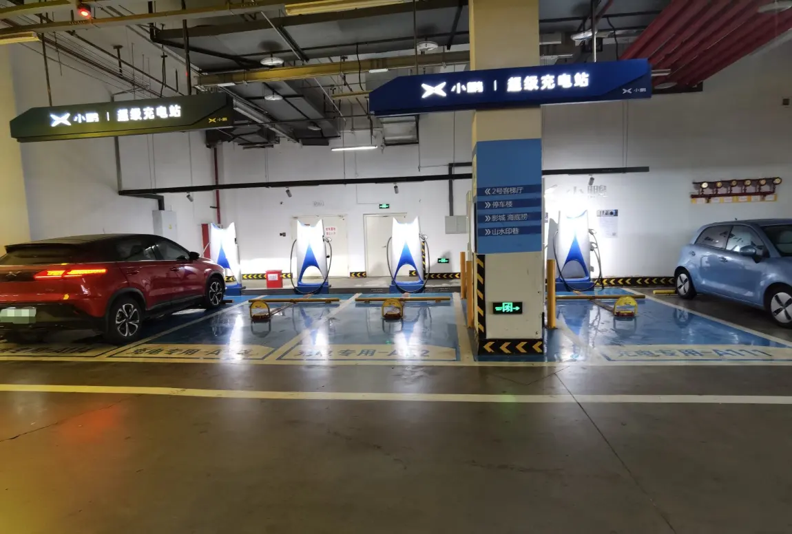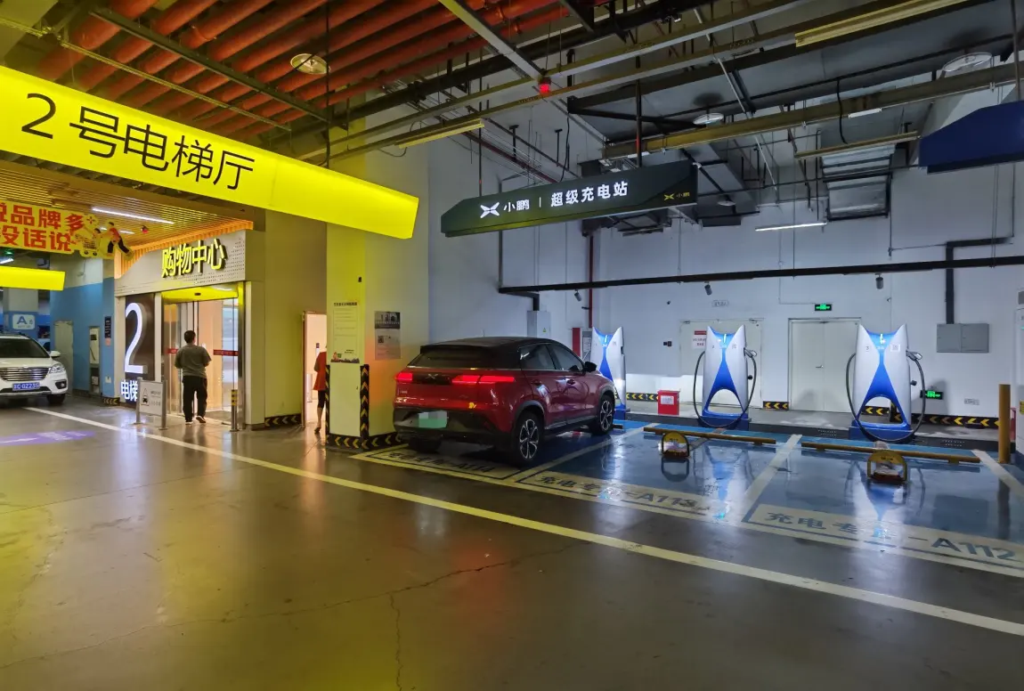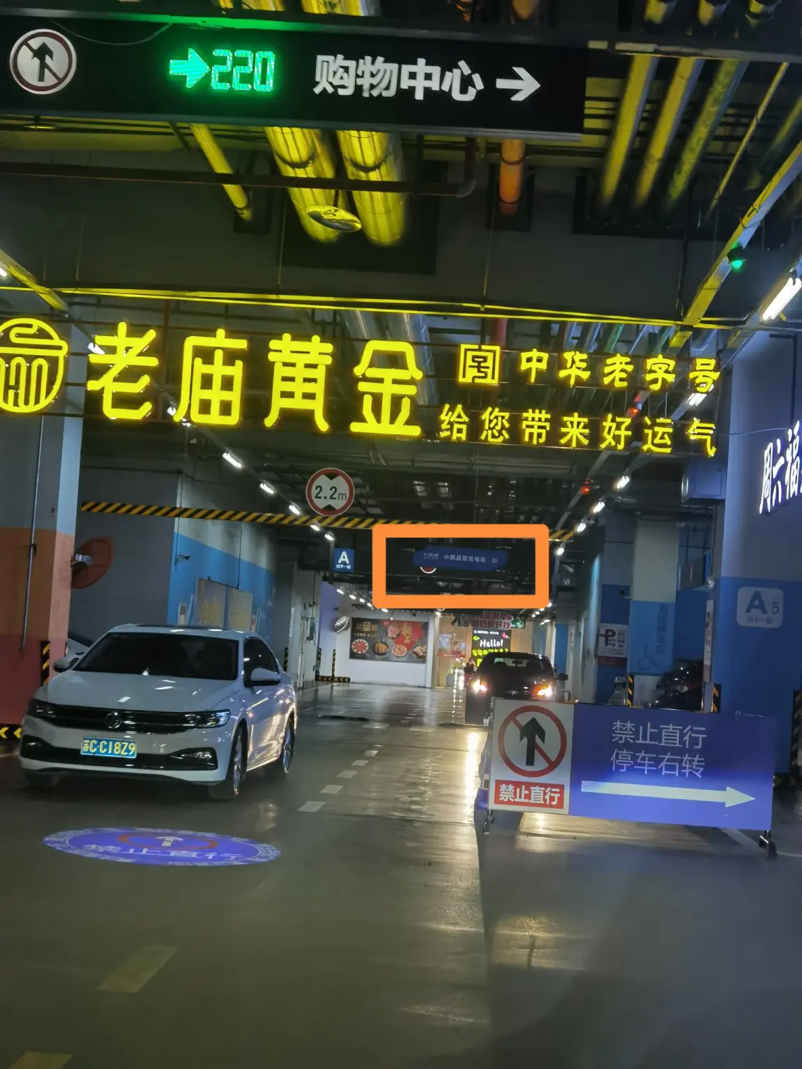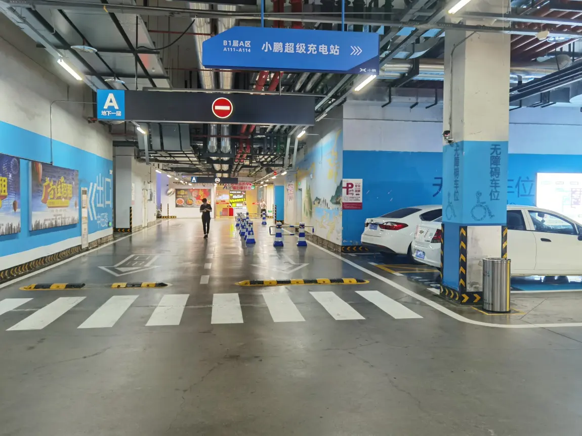 特别注意:地下停车场最近临时调整了通行标志,到达停车场B1层后第一个路口禁止直行,需要右转绕一圈。(如下图所示,原来在第二个路口右转即可到的小鹏超充站指示牌,建议小鹏调整指示位置)
