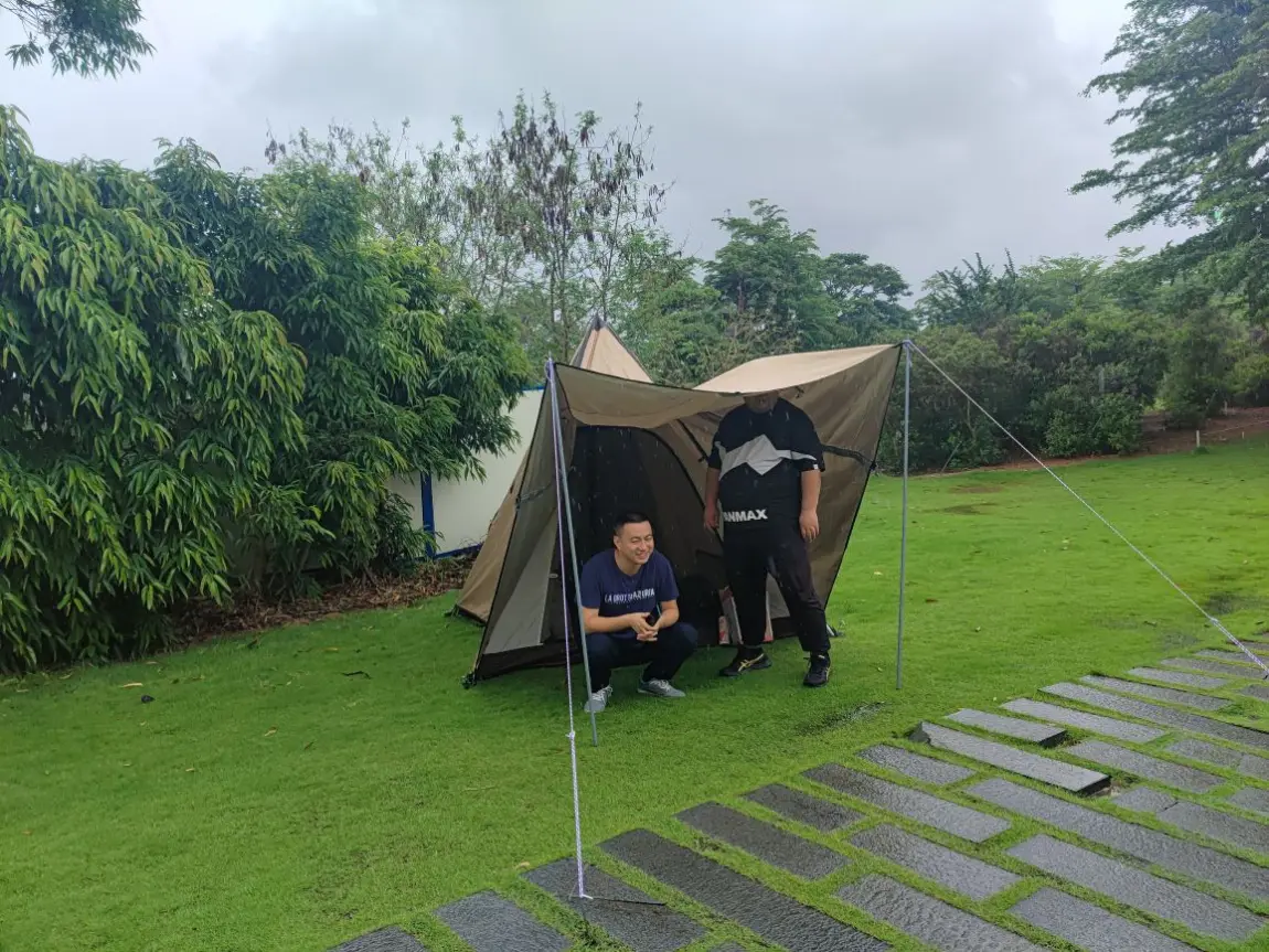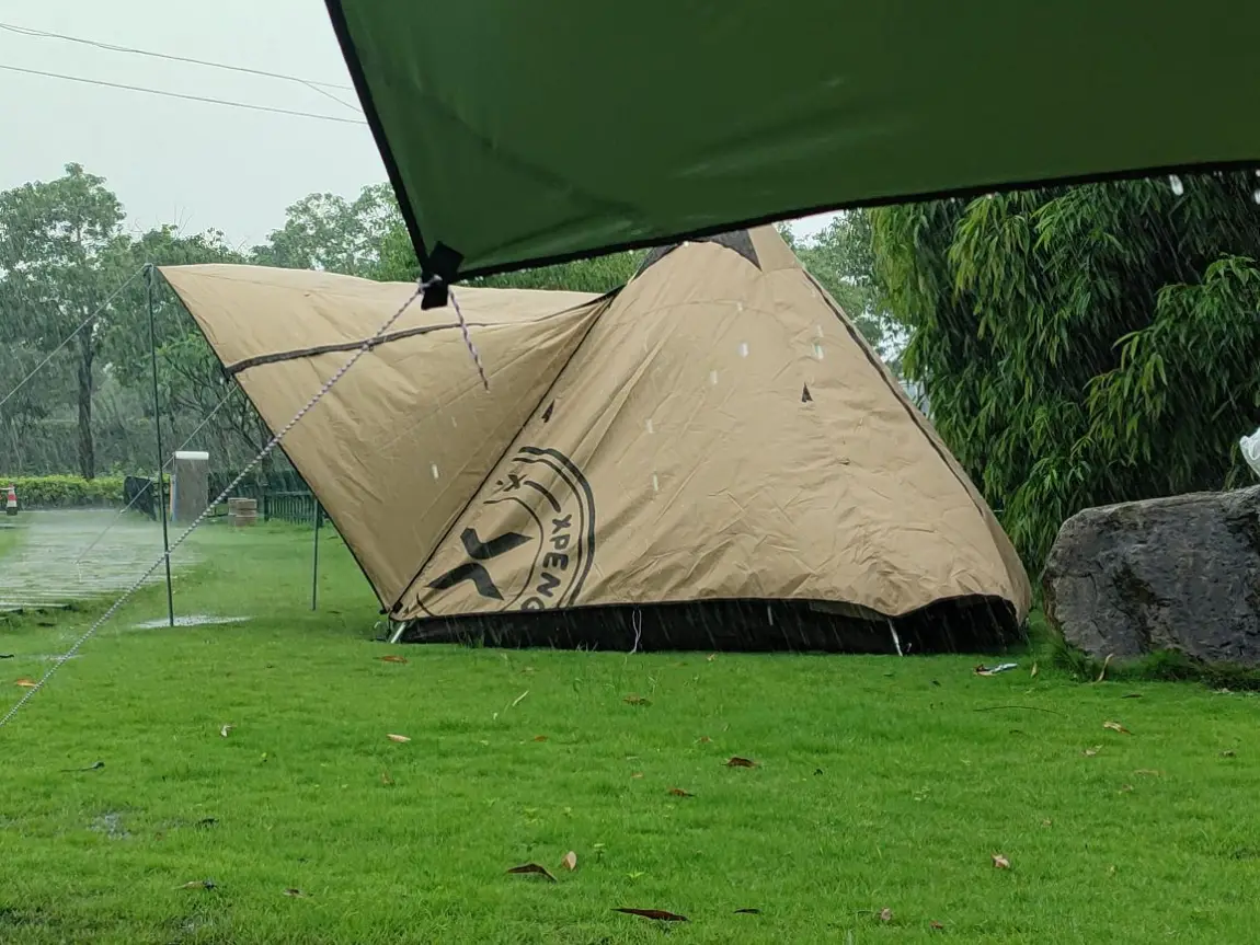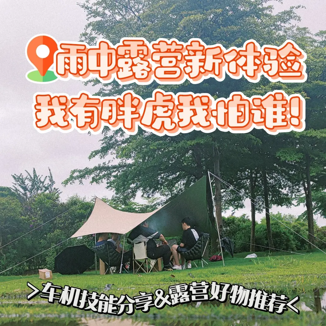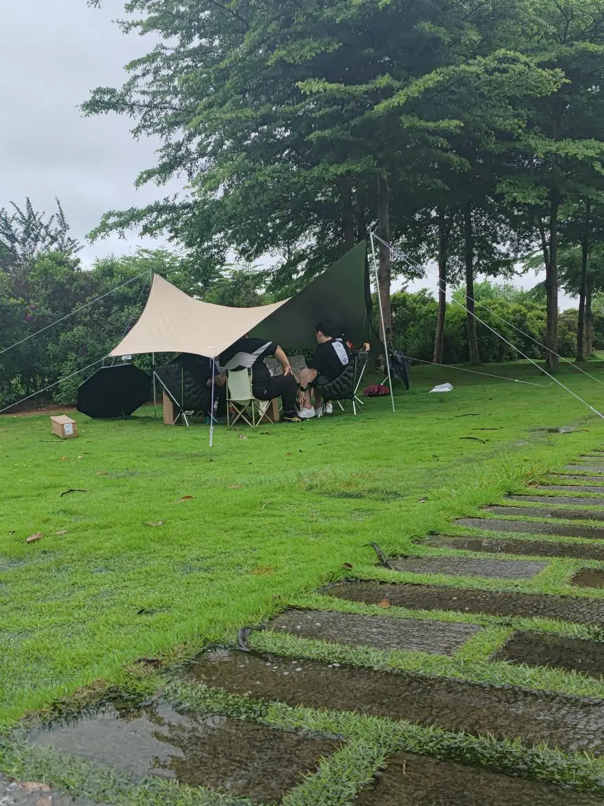 🏕️天气就像小盆友的心情,莫名其妙的就阴了,先是下起了小雨,随后雨慢慢变大.....帐篷搭好了,但是天幕还只是完工了了一半,只好暂时躲在树下避雨,看着半成品的天幕被风雨吹得摇摇欲坠。。。