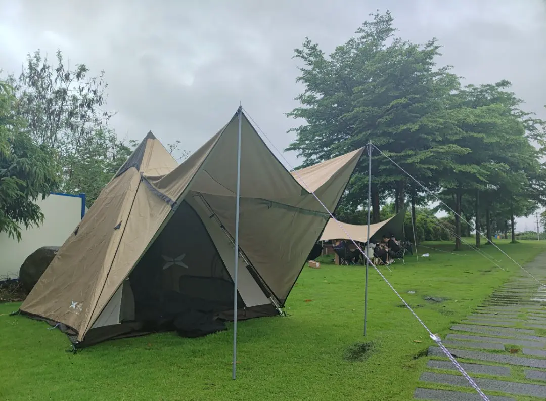趁着雨小的间隙,5个壮汉和1个打酱油的鹏友,把天幕一点点搭好,终于有了露营的仪式感。
