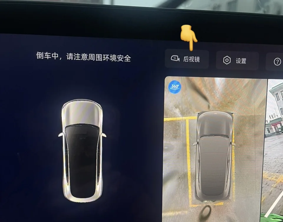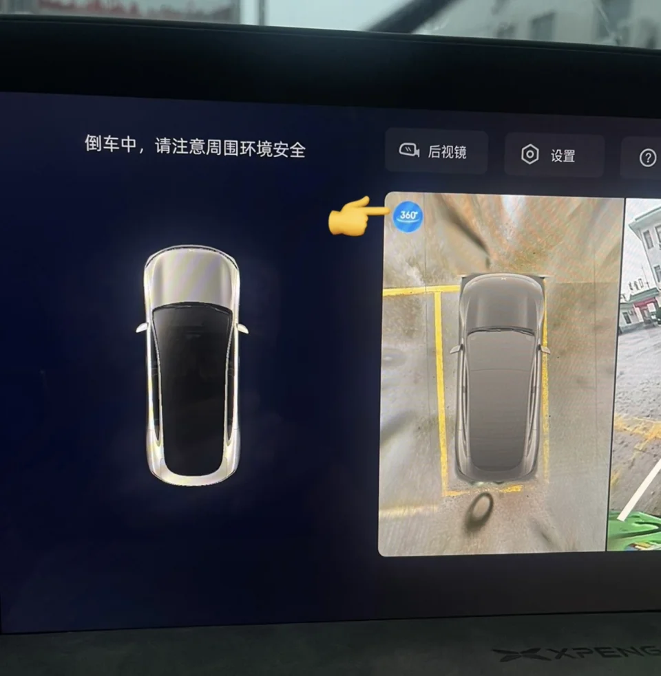 ⭐我们可以将档位挂入倒挡以后,点击屏幕中的360,这个时候影像就会从车辆上方显示车辆所有角度,画面还是很清晰的。