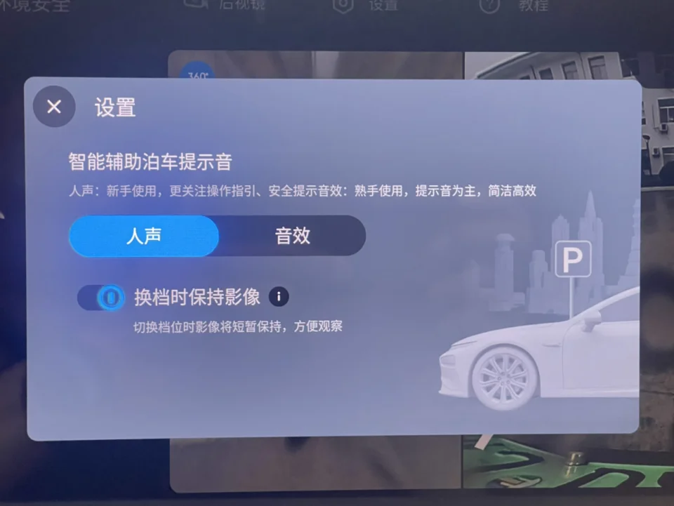 我的设置是智能辅助泊车,一般我在狭窄的道路和自动泊车时就会使用。在行车时也能快速的打开。只需轻轻一按就能实现。 -------------------------------------------------- 📖