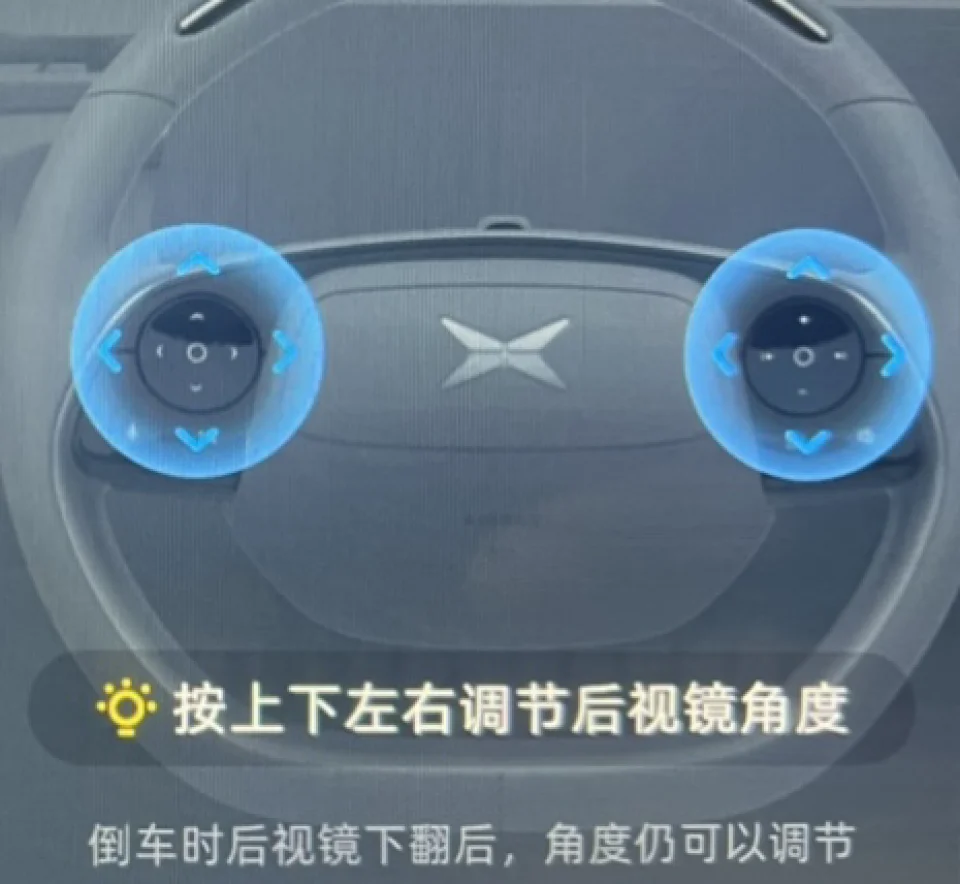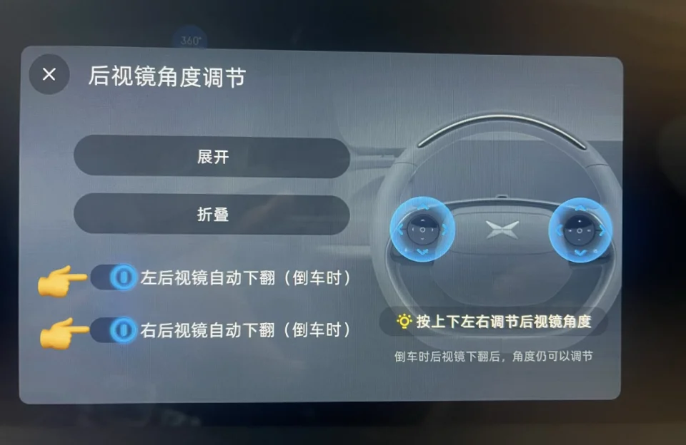 ❹后视镜角度调节和下翻: 每个人开车观察后视镜角度都会不一样,因此调整后视镜角度尤其重要。 ⭐我们可以在挂入R档以后,点击360影像上方的“后视镜”,这个时候我们就可以通过方向盘上下左右调节了。 (当然也可以通过呼叫小p,打开后视镜调节。)