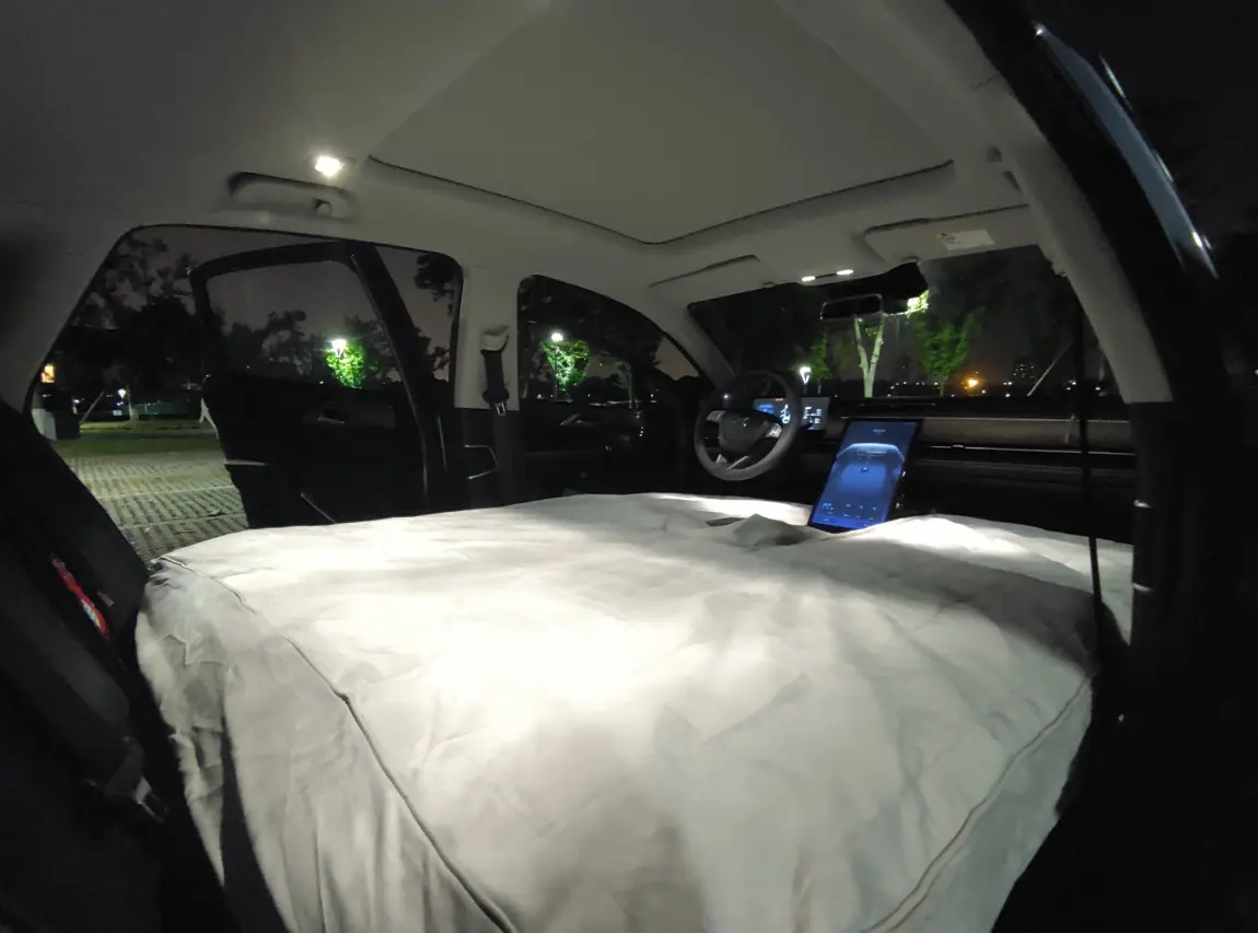再说说P5,因为是第一次露宿,连睡眠套装都是当场开封的,第一次不太熟练,全部铺好至少花了30分钟(第二天收起来装好花了15分钟)。建议大家铺套装时候,旁边最好是有一块平坦干净的地方,能把这些东西摊开,不然只在后备箱操作,真是不太方便。