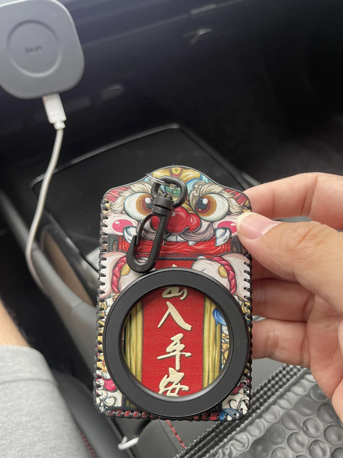 虽然P7有蓝牙钥匙,但是无网络下锁不了车,所以还是要带上nfc卡或钥匙以防万一。我自制了一个磁吸卡套,在绳挂皮套上加了一个磁吸环,既解决整理收纳又避免无意间丢失的困扰🥹。