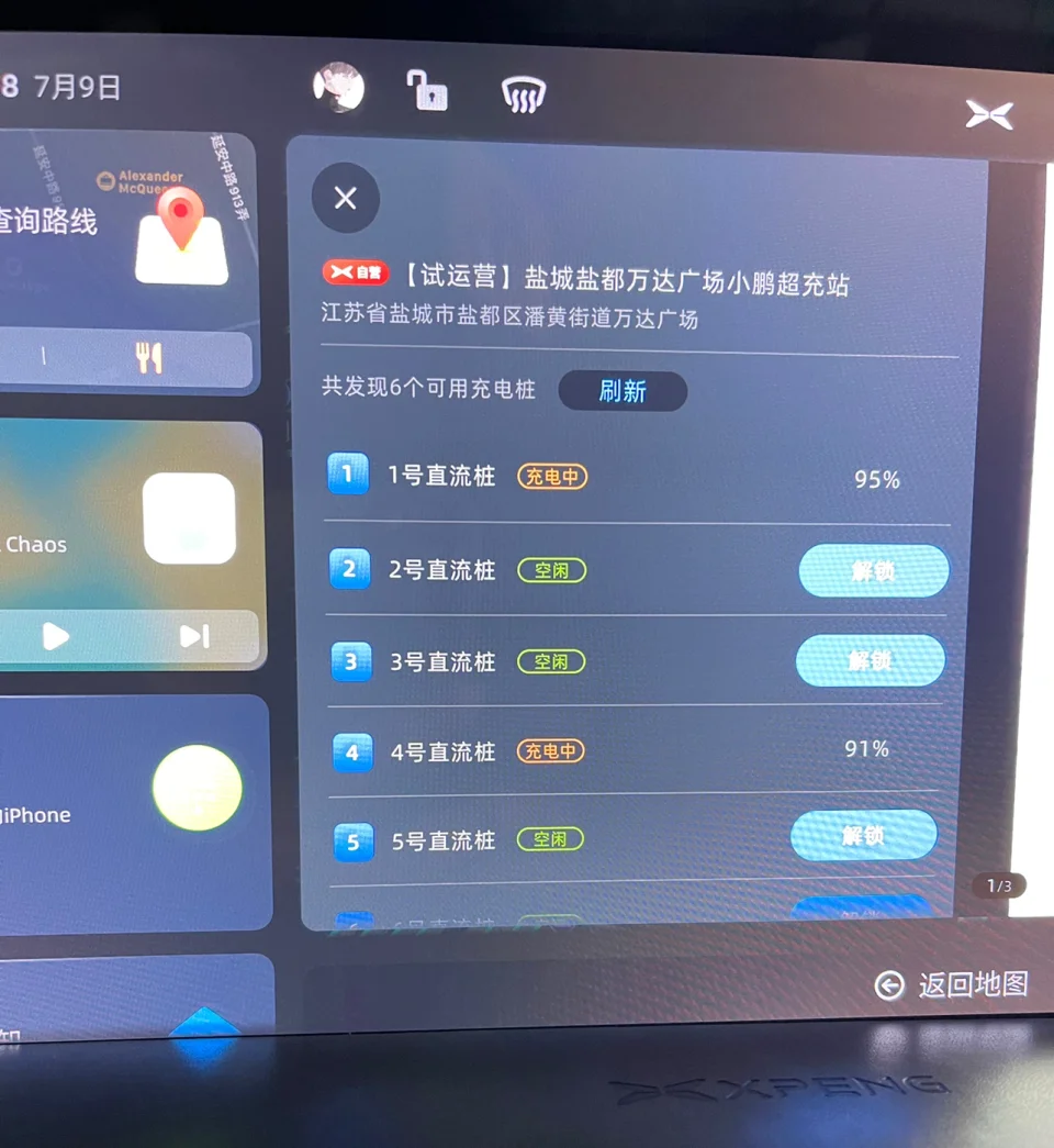 中控大屏就会跳出超充站充电桩详情。