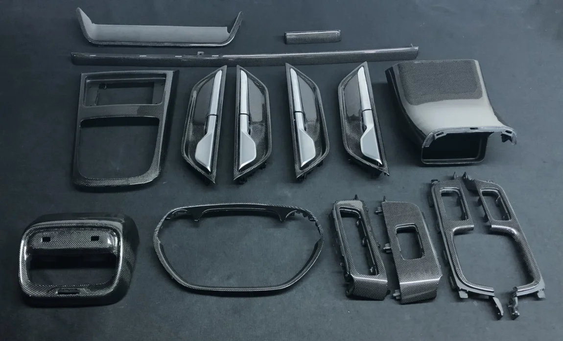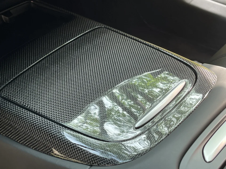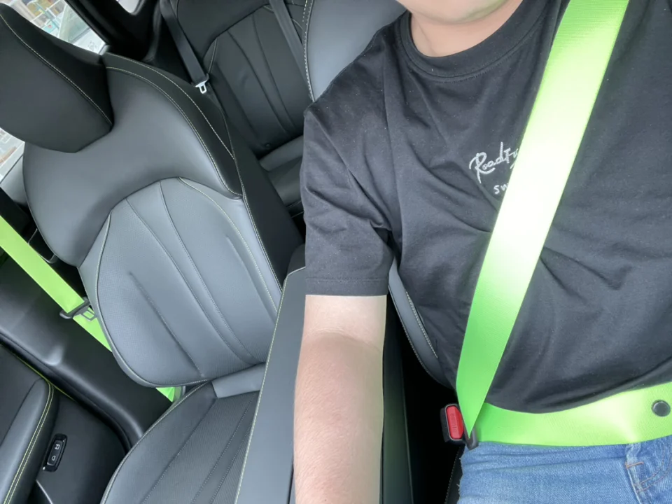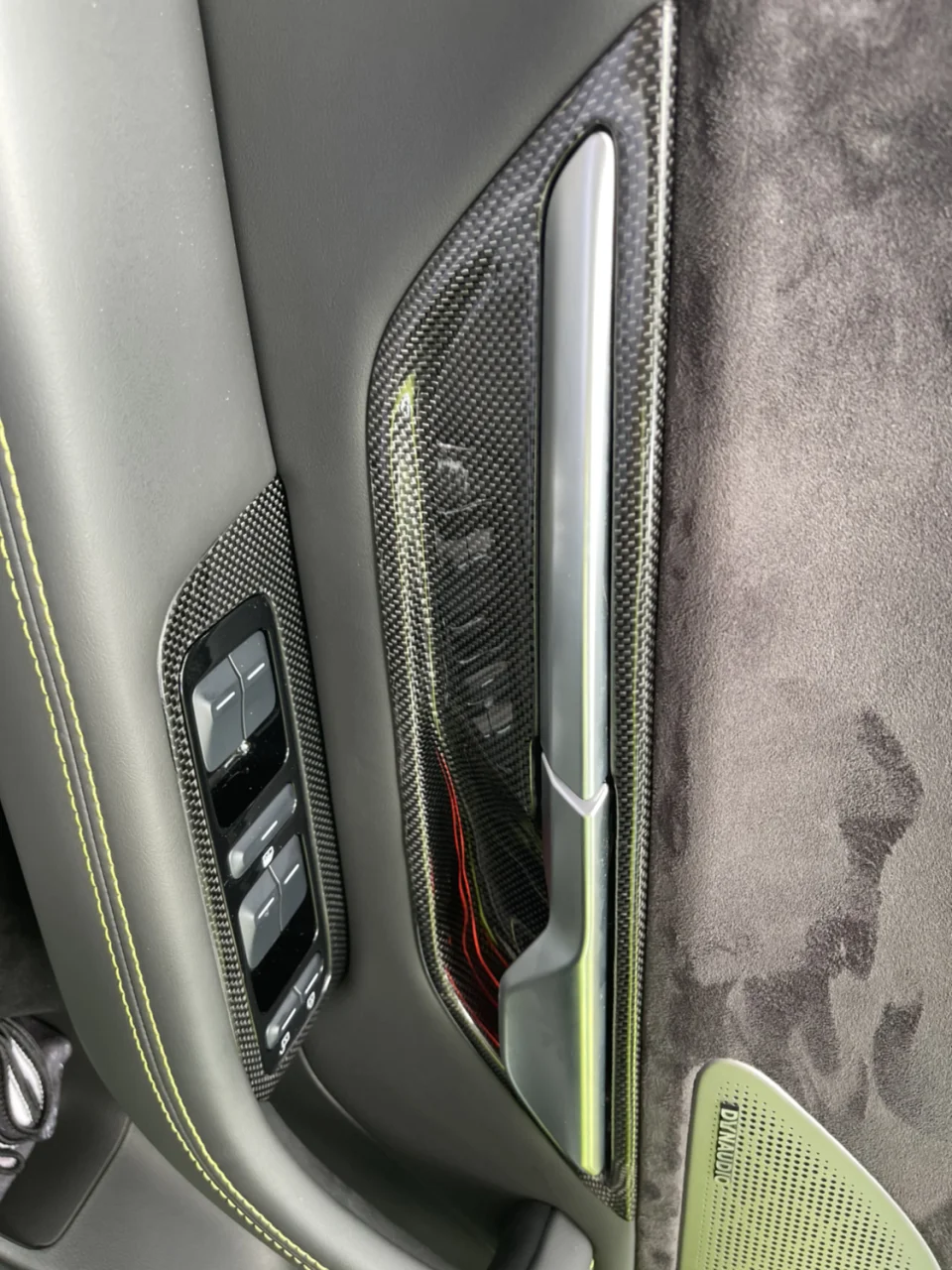 车内改装起因是门板上的那块木纹饰板,我真的喜欢不来那种木纹,就开始想怎么去改,最后找到了方案,4个门板包反绒皮,方向盘包翻毛皮,前档下方也包了一大条翻毛皮作为呼应,安全带改绿色,内饰所有塑料件还有后视镜壳,找碳厂家做包覆碳!