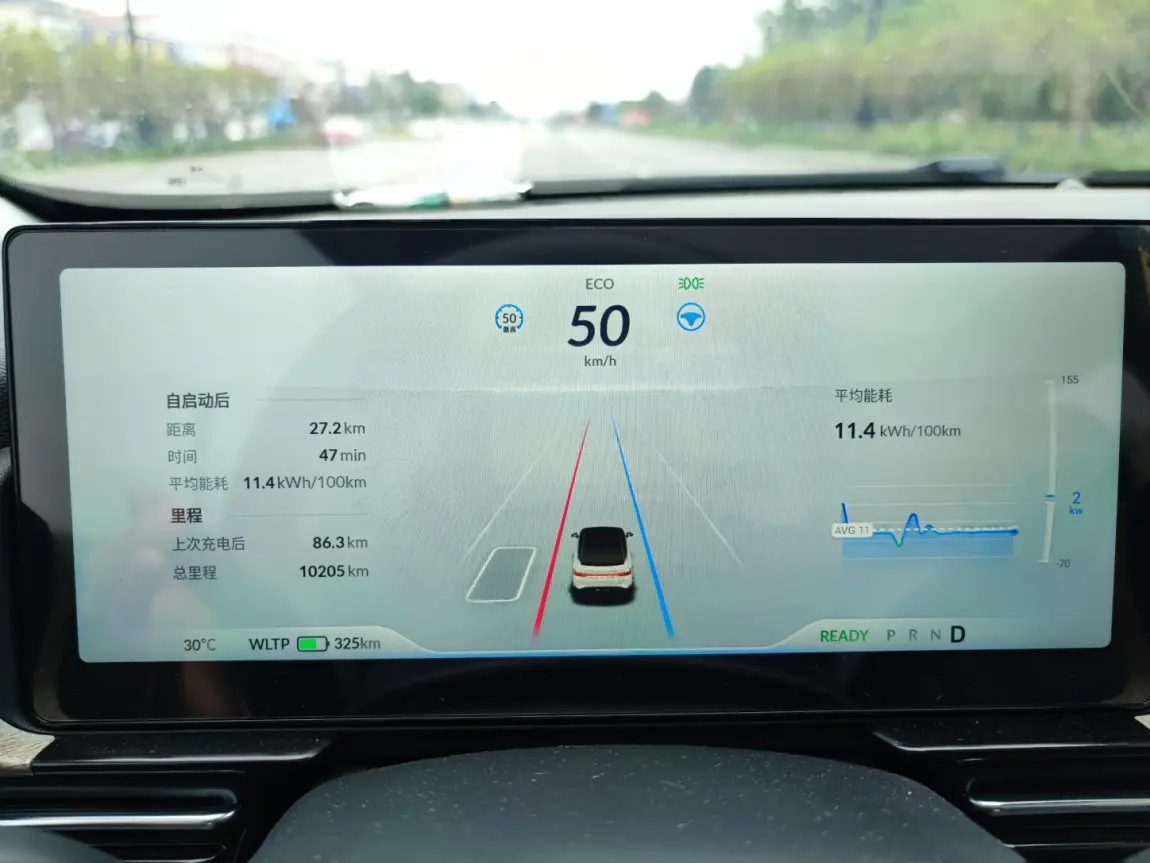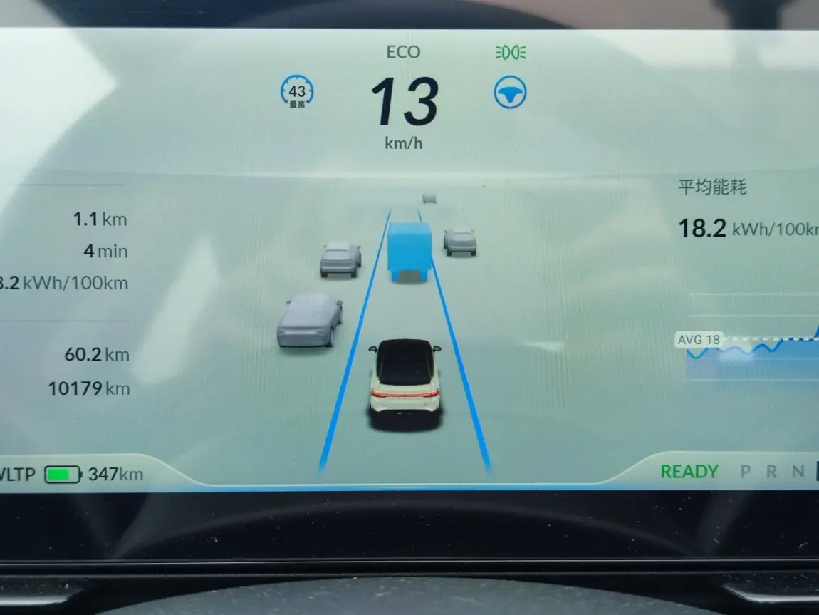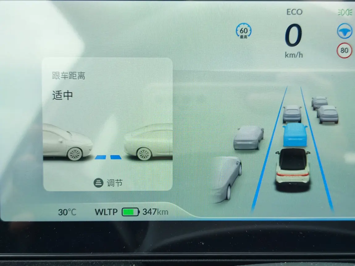 此时,我们可以通过方向盘左侧的按钮来进行调整跟车距离,通过左侧的滚轮来调整巡航速度。个人感觉还是比较方便的。跟车距离有远、近、中三个模式,建议大家可以选择适中模式,毕竟太远了也容易被插队。