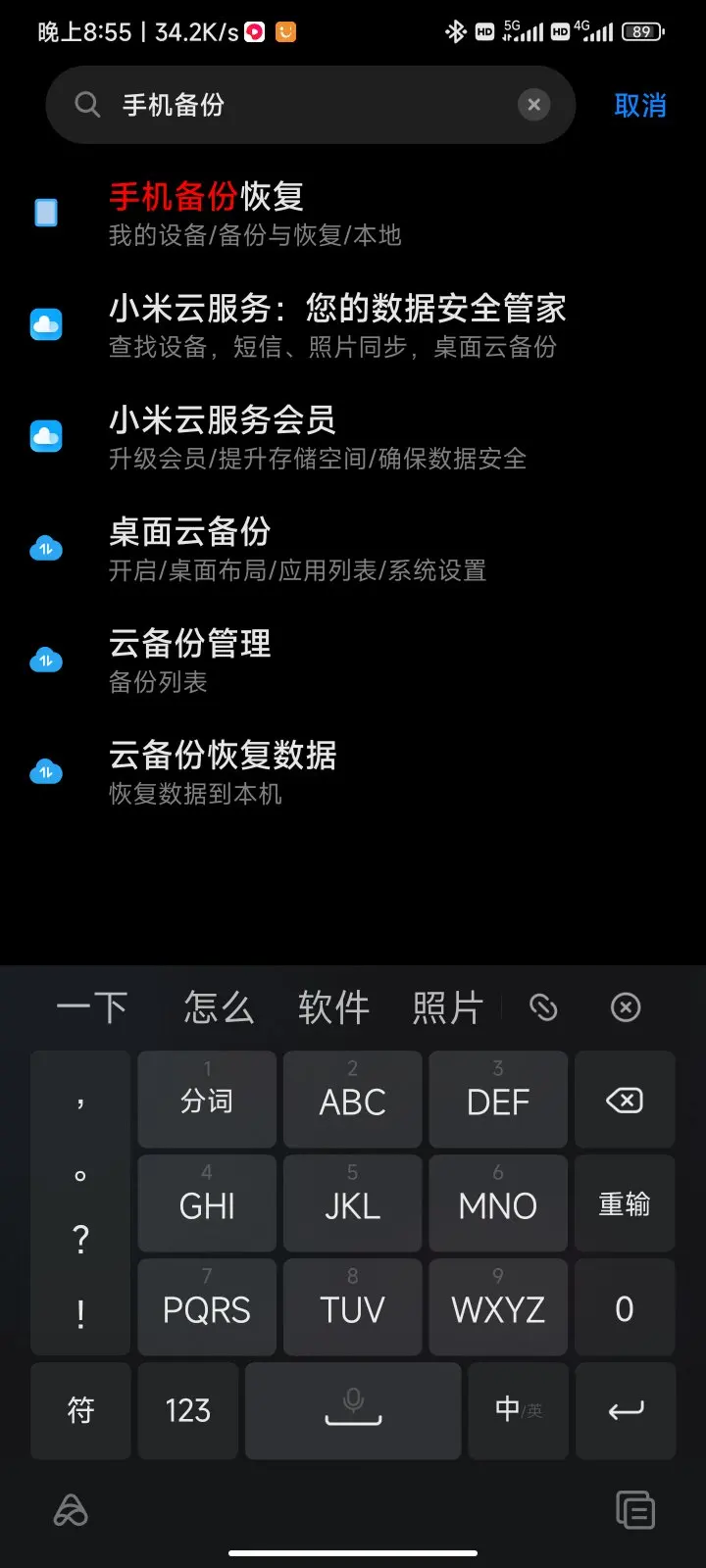 Step2:在手机设置中搜索"手机备份",选择第一个。