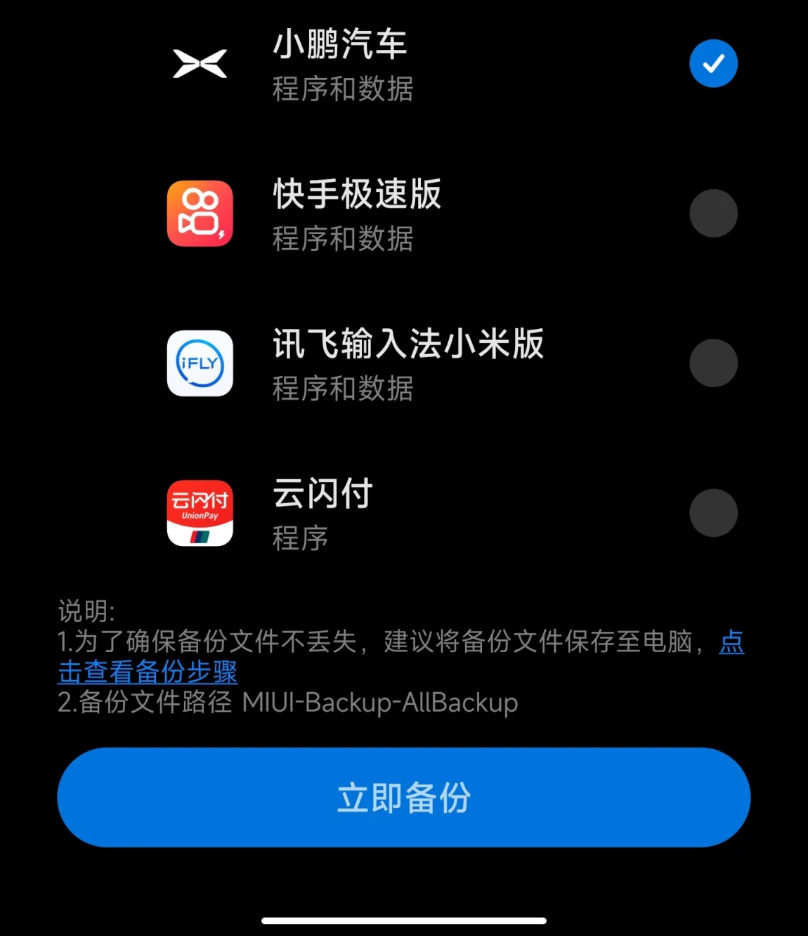 Step3:在备份设置中仅选择第三方应用数据中的"小鹏汽车"APP