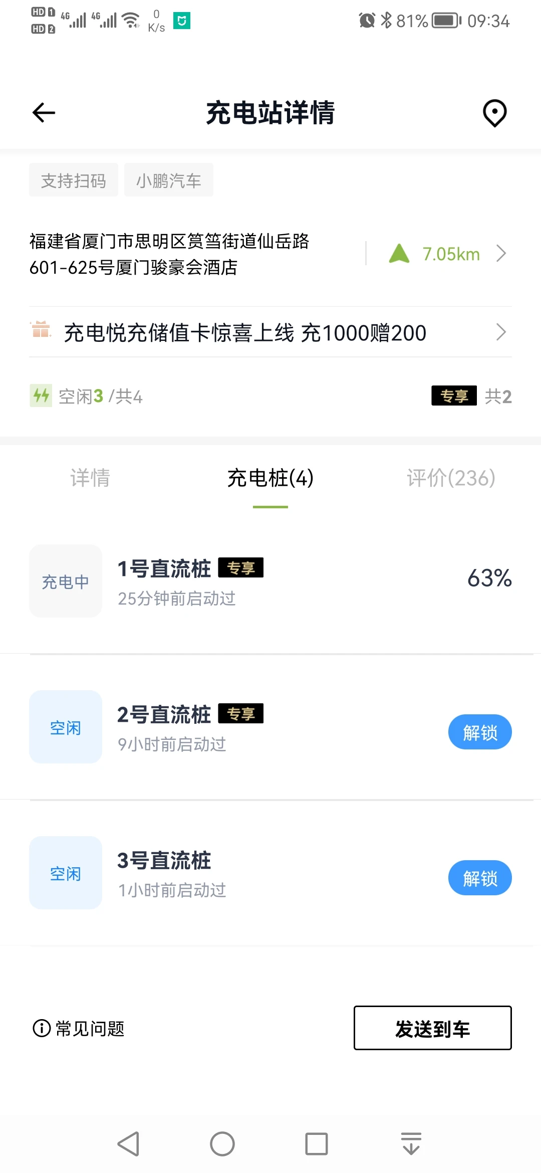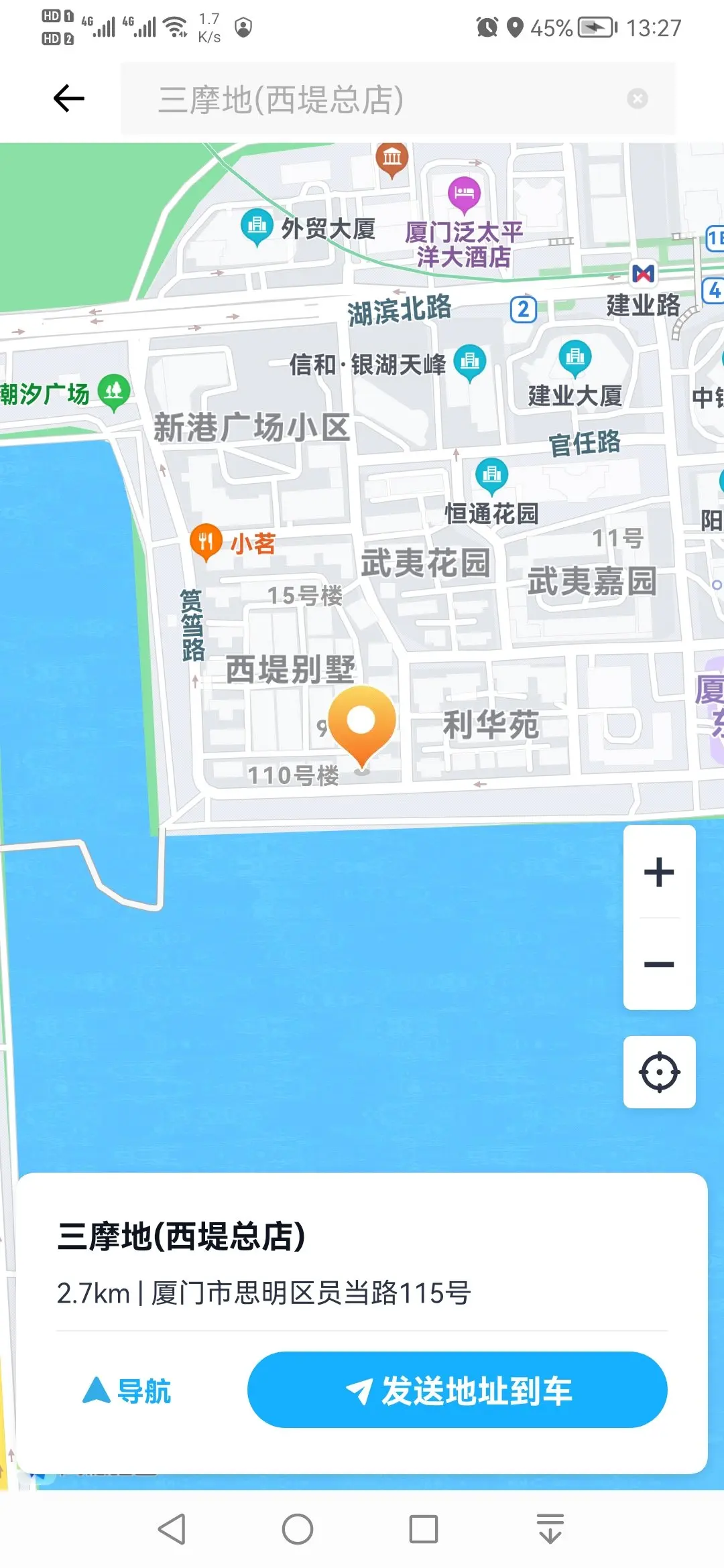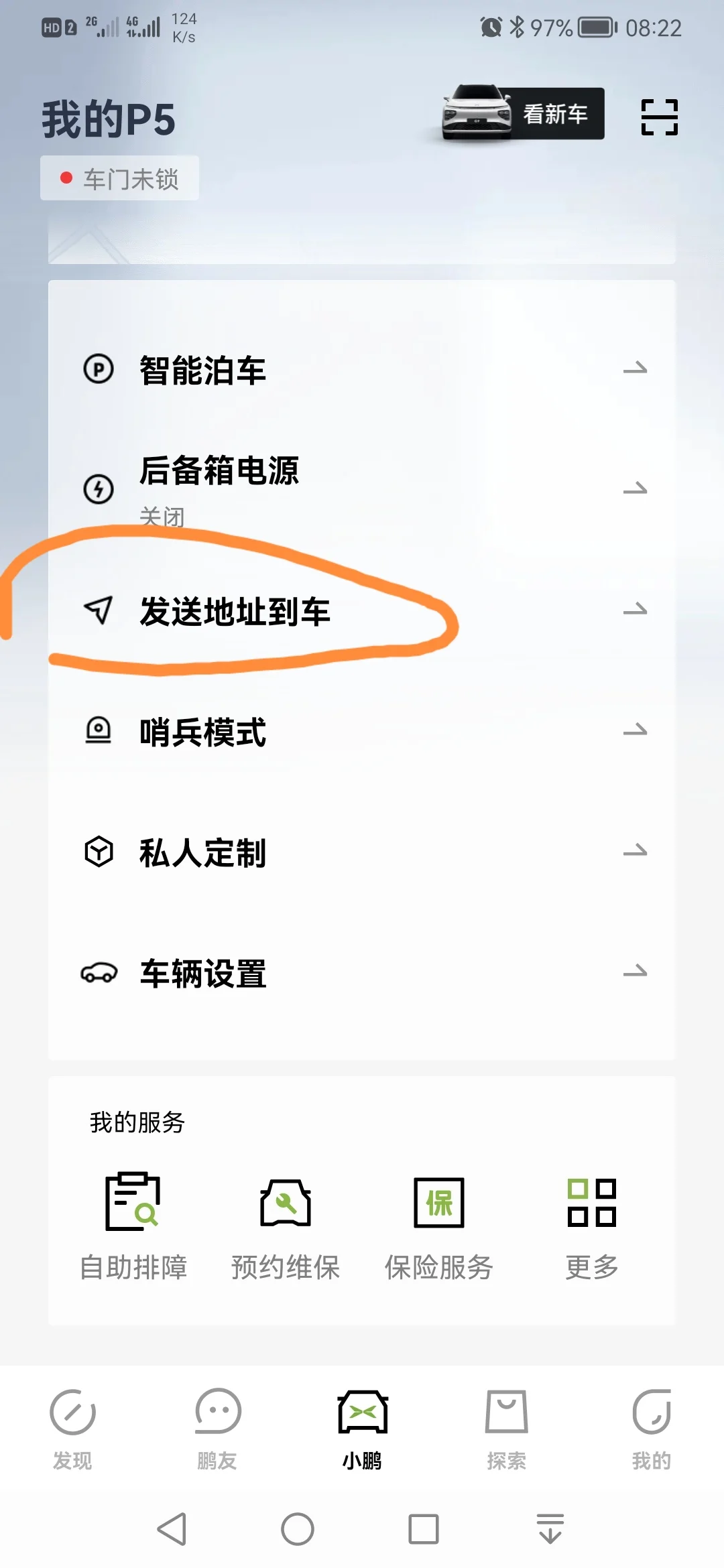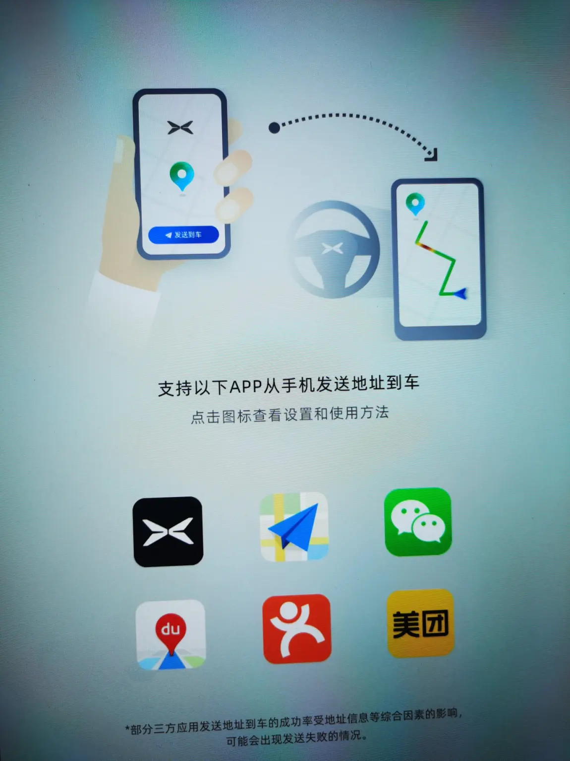 问题三、手机地图导航如何发送到车机大屏上?小鹏支持从手机多个app分享地址到车机,例如:小鹏app、美团、高德地图、百度地图、大众点评、微信等。有以下3种方式可将指定的地址发送到车辆:方式一:通过小鹏汽车App发送地址到车在车控页面点击【发送地址到车】卡片进入地图页,点击搜索结果右侧的【发送】按钮或地址详情可将指定的目的地地址发送到车辆。