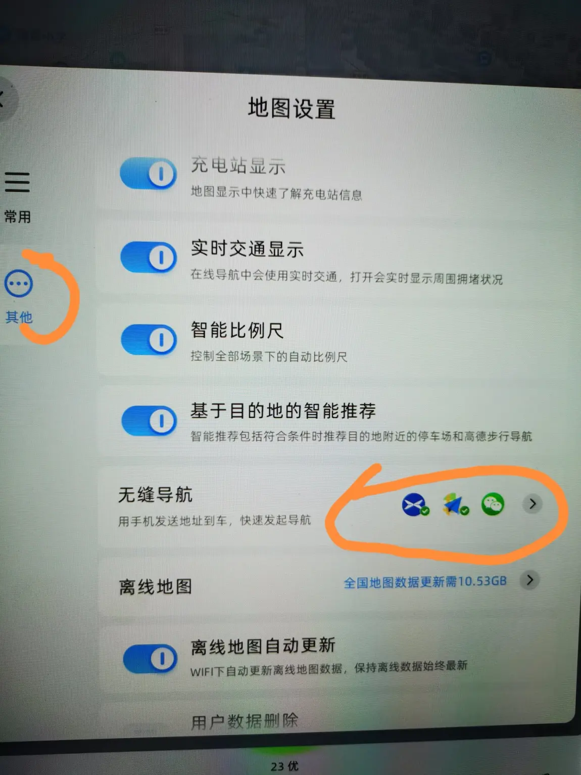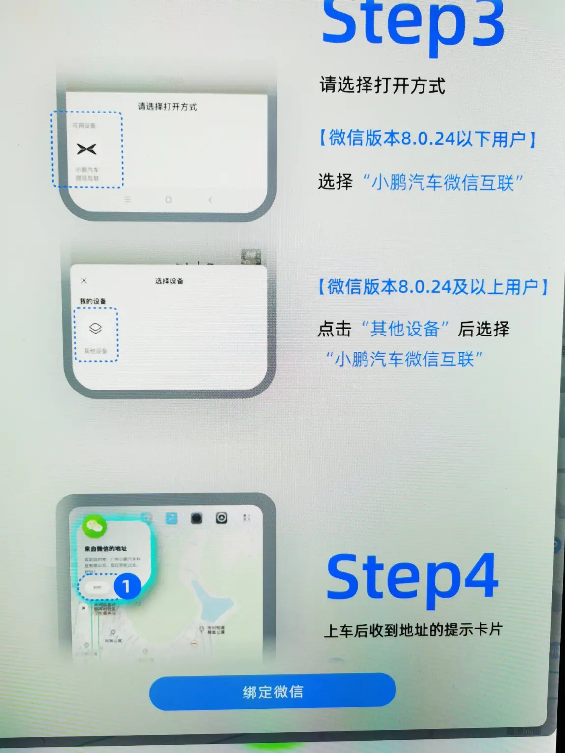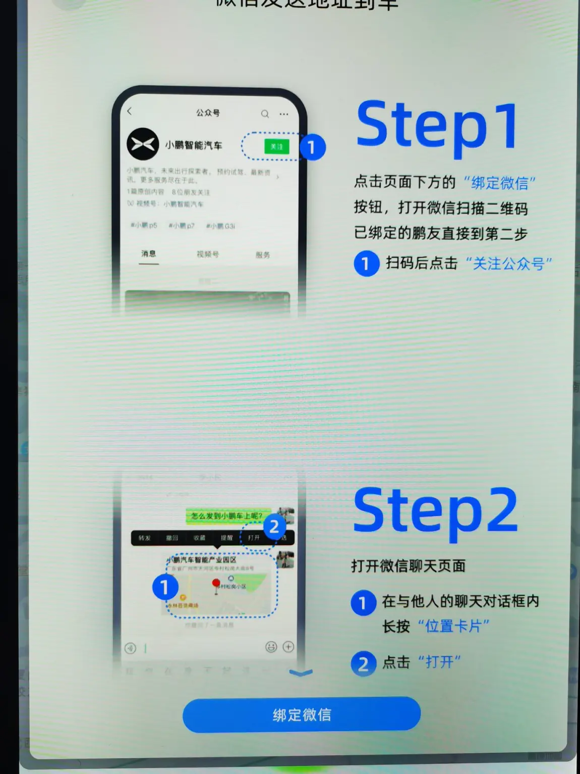 方式三:通过微信发送地址到车。打开车机中控屏导航界面,选择【设置】—【无缝导航】—【微信】,根据指引打开微信扫码关注小鹏汽车公众号,绑定后即可将微信聊天中的地址发送到大屏,具体操作:打开微信聊天框—长按地址消息—打开—选择小鹏汽车发送到车,这时点击大屏目的地消息即可开始导航。