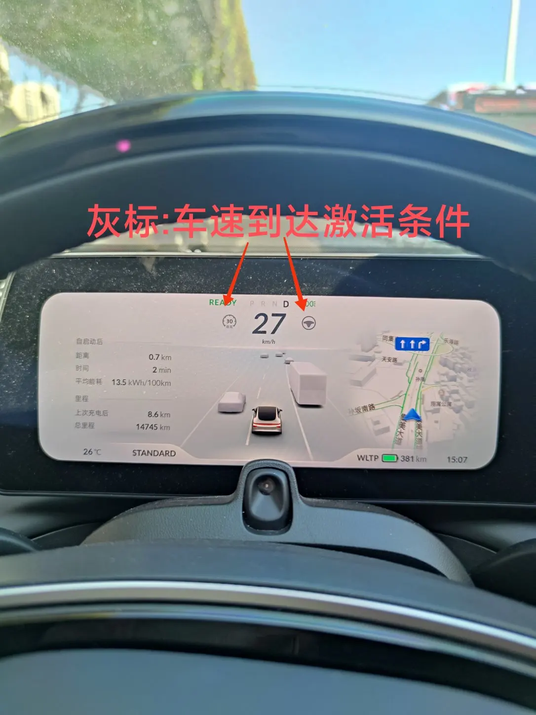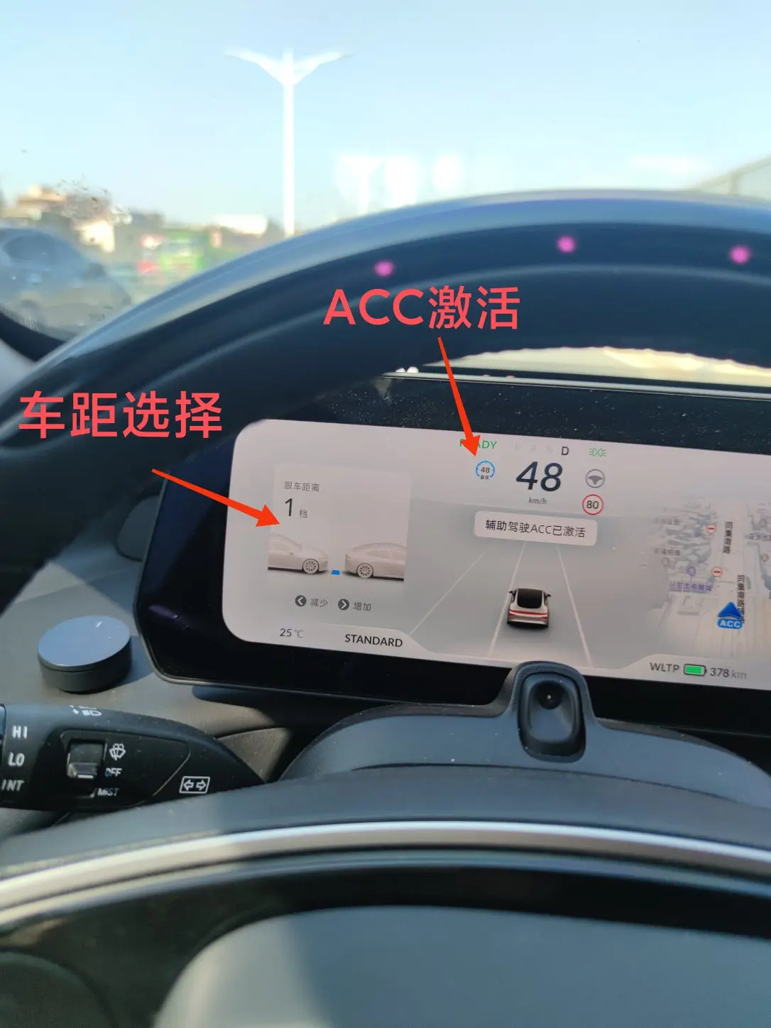 间的距离,直到达到合适的巡航速度。自适应巡航(ACC)主要用于高速公路等干燥的直路上行驶,在城市街道上不应使用自适应巡航(ACC)。在此开个小灶,分享一下老司机的深度体验:启动流程如下:当车速15公里以上时,仪表盘会出现灰色时速图标(ACC)和主向盘图标(LCC),意思是具备激活条件,但尚未激活。当路况车况清晰简单的时候,在限速内右手档位拨档到底1次激活ACC,当下的时速就是巡航的最高限速,同时按动方向盘左侧的左方向调整键(<>)设置安全车距,有较远、较近、适中3档设置。ACC激活后图标变蓝色,见下图。