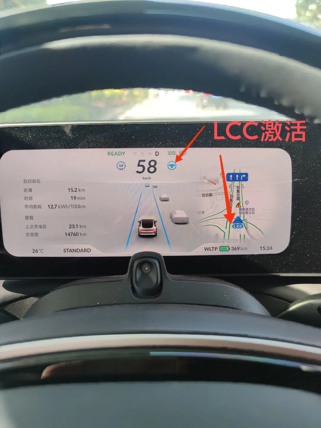 右手连续向下拨档2次,激活LCC,激活后图标变蓝,导航光标会显示LCC。激活LCC后,如需变道,拨动转向灯,会自动调整到相应车道。