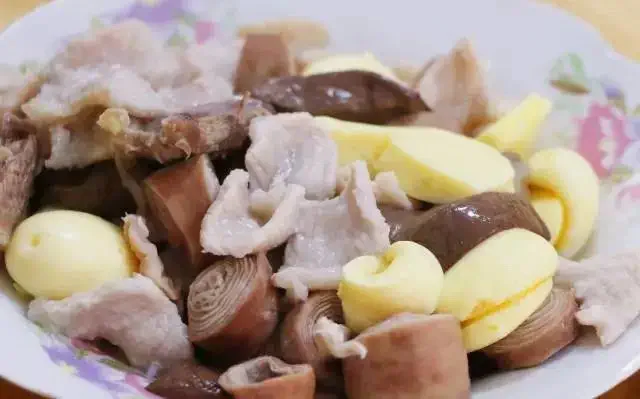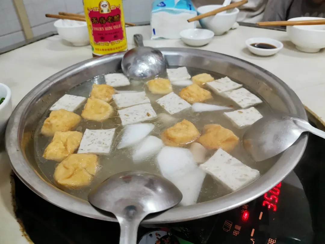 这汤锅就跟清水火锅似的,把水烧开,加上大肠、蛋肠、鹌鹑蛋、豆腐干等食材及各种佐料作底料,人们还可以自行选择加肉。