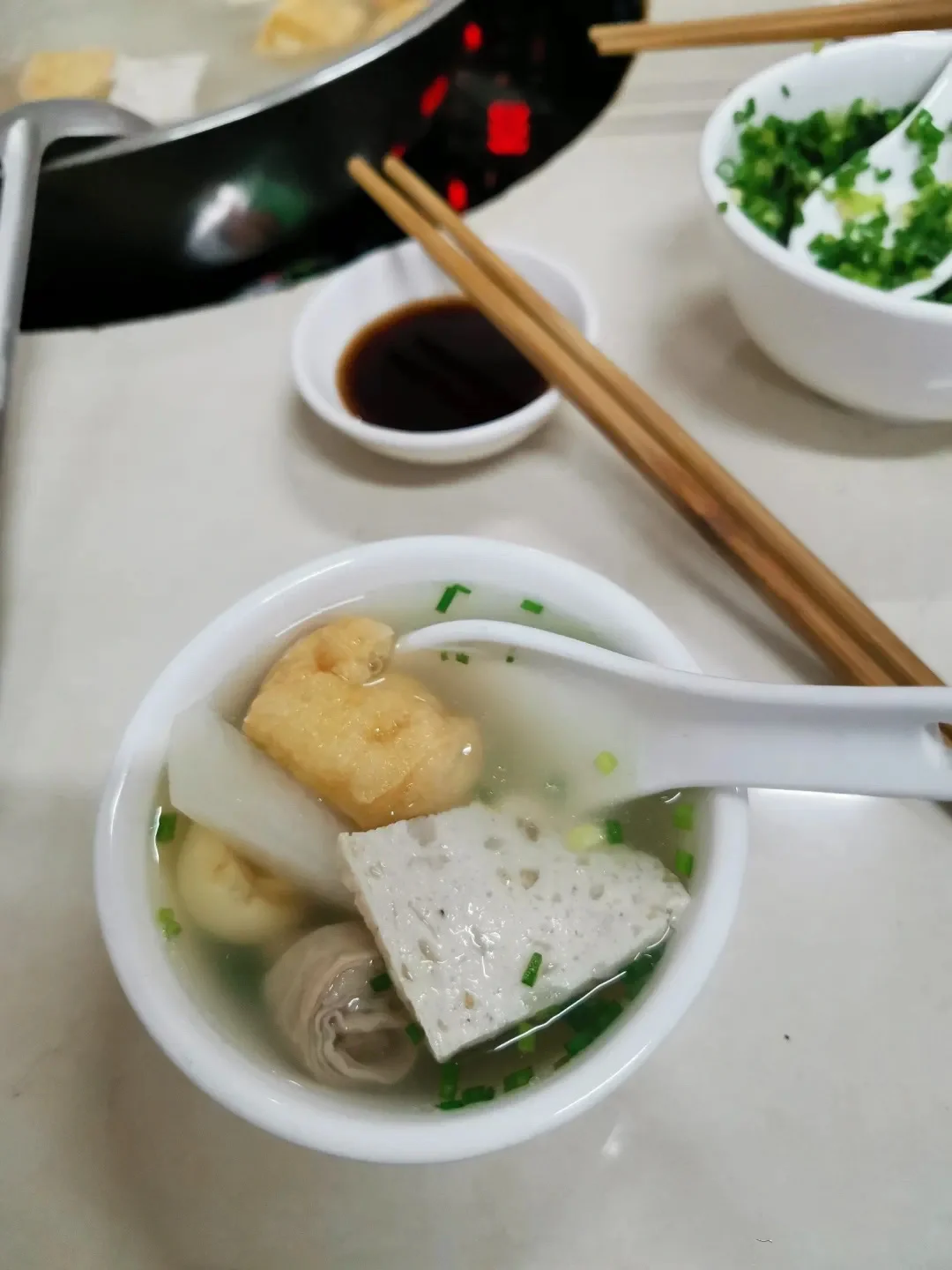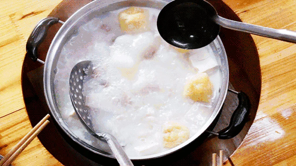 当已有些凉的汤锅端上来,再次煮开时,所散发的香味是我所不能描述的。雾气缭绕中,烧得有点泛黄的汤汁咕噜噜地翻滚着,我的肚子也咕噜噜地叫着。
