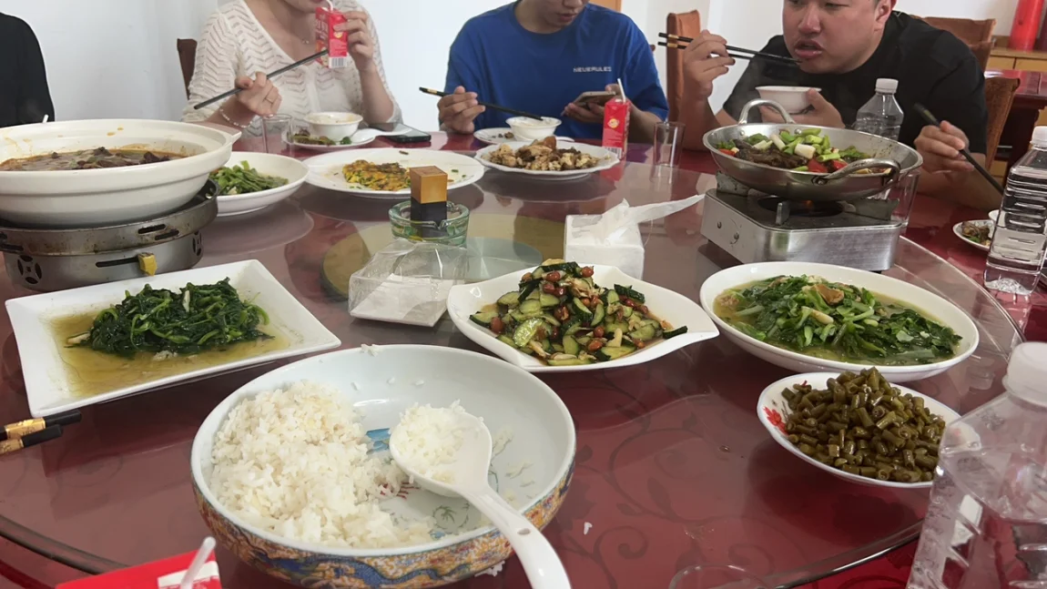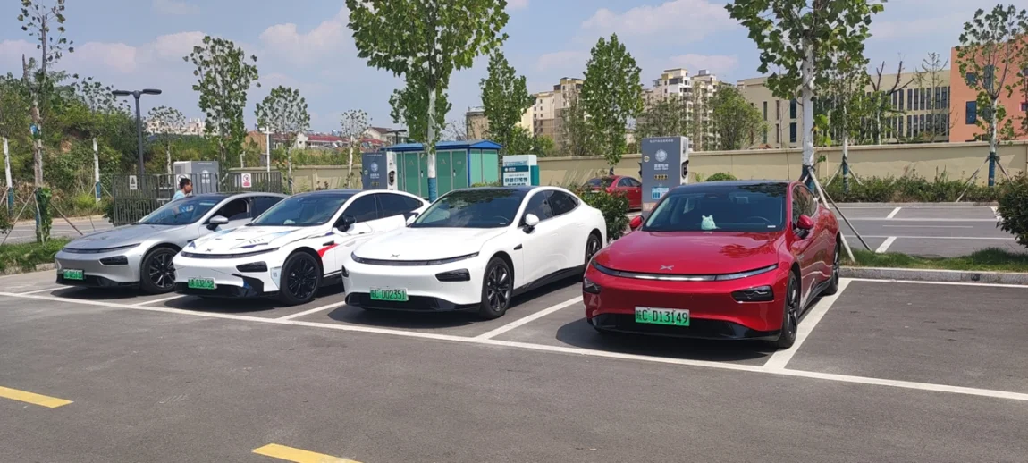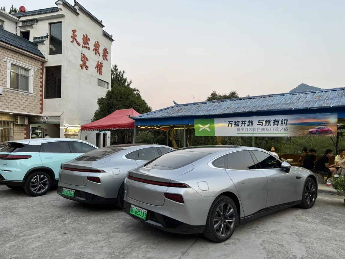 此行车队中以P7居多,我们几台超长续航的选择下高速之后再进行补电,把高速服务区的充电桩留给续航较短的P5和G3i。充电桩旁边正好有土菜馆,吃个午饭准备进山。