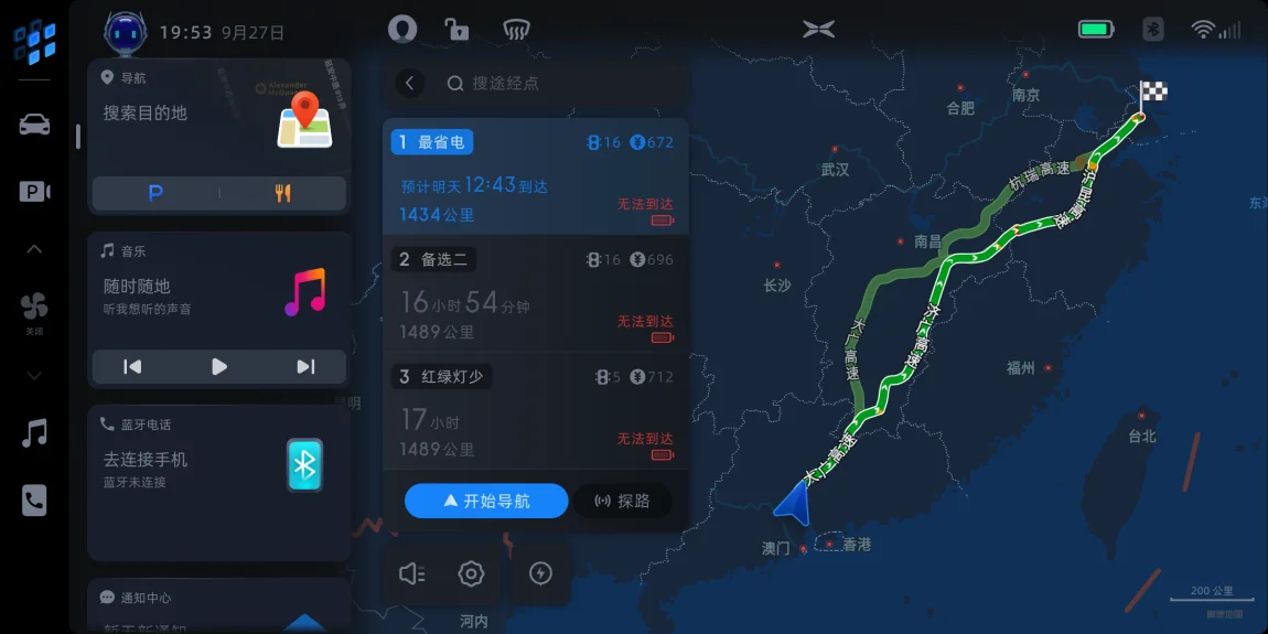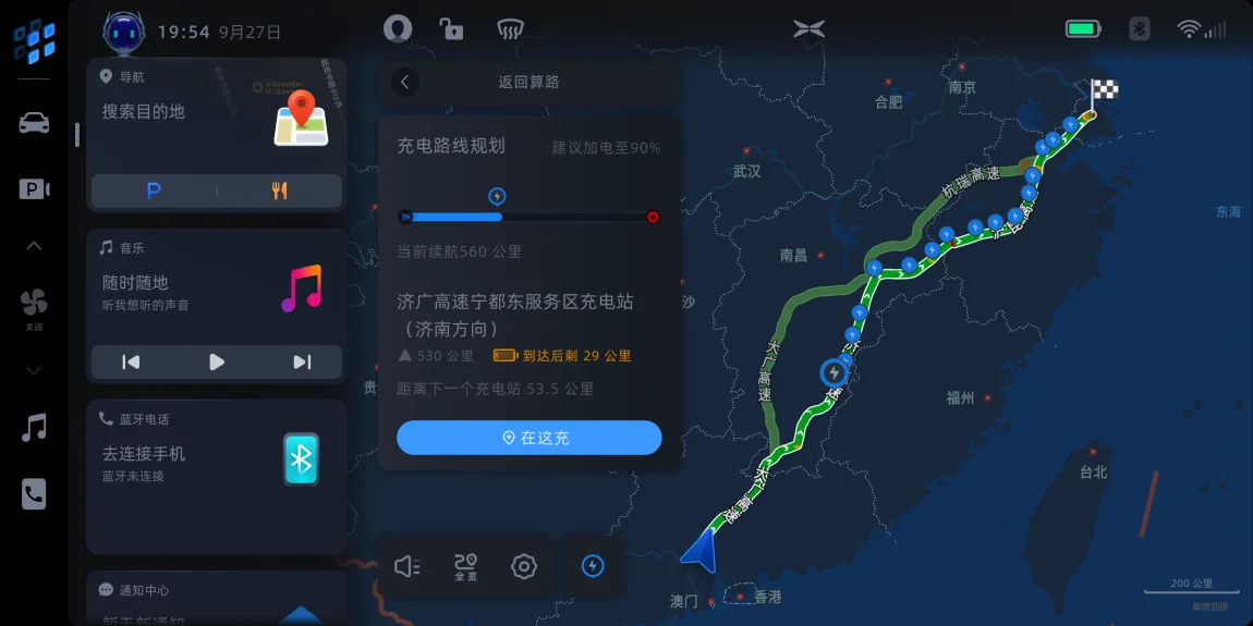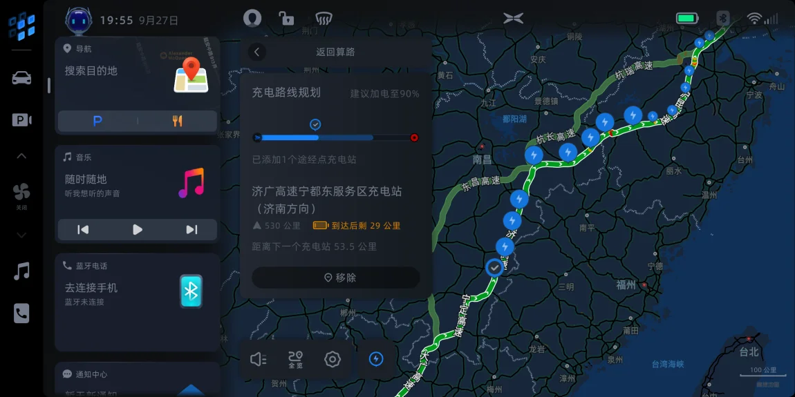 1、规划中默认为补电到90%,车辆补电量会影响后面补电点的是否可达,建议用户在行车中注意行车变化;