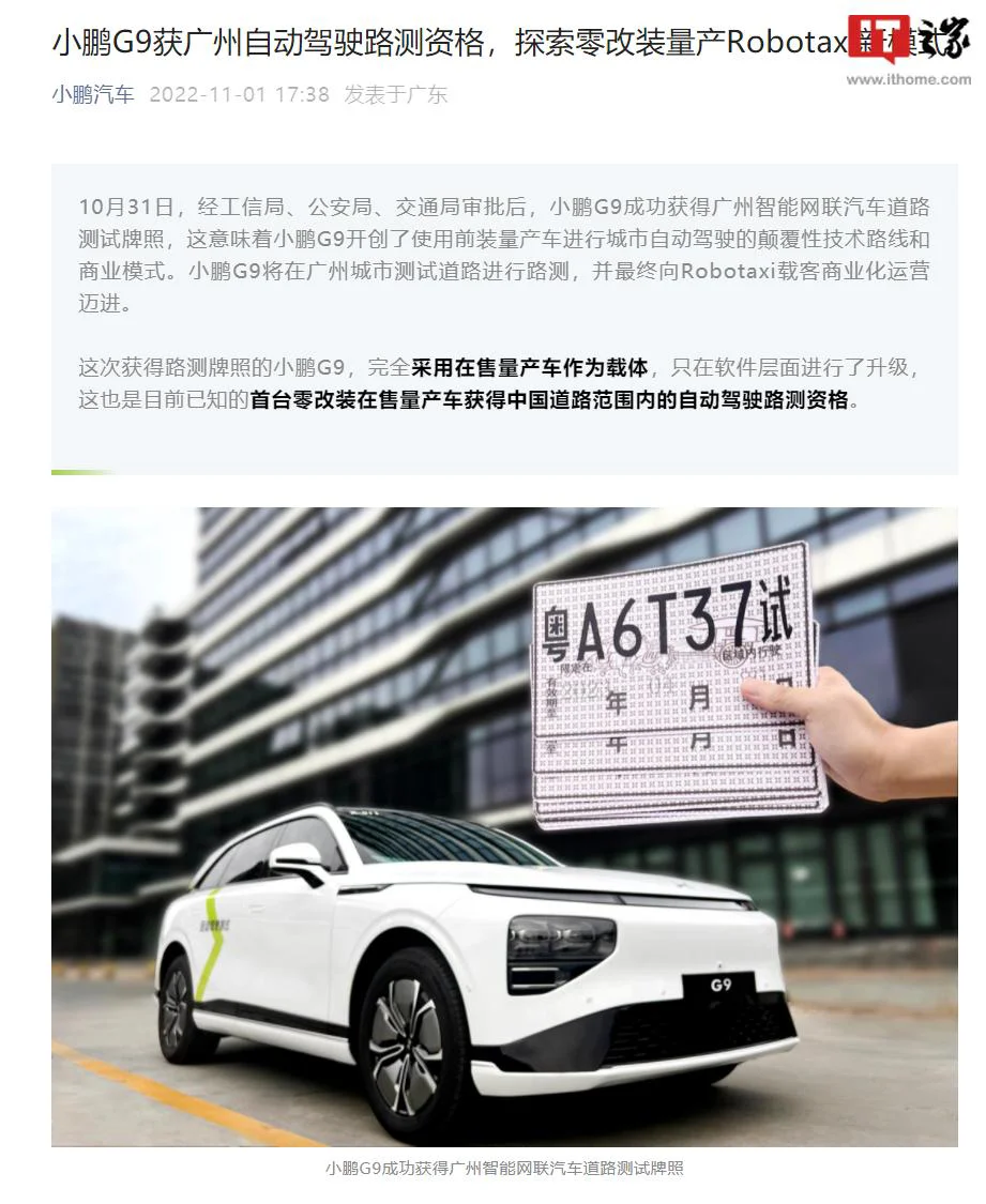 据小鹏汽车,10 月 31 日,经工信局、公安局、交通局审批后,小鹏 G9 成功获得广州智能网联汽车道路测试牌照,这意味着小鹏 G9 开创了使用前装量产车进行城市自动驾驶的技术路线和商业模式。小鹏 G9 将在广州城市测试道路进行路测,并最终向 Robotaxi 载客商业化运营迈进。#玩转社区#