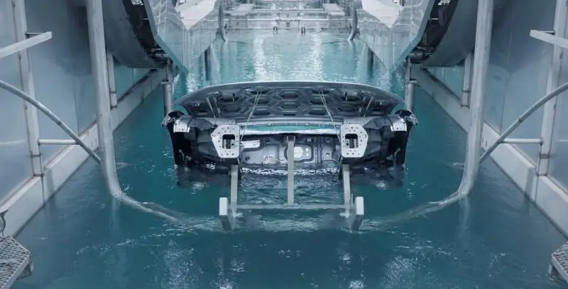 我们首先参观了焊装车间,这里主要就是对车辆的侧围、下车体、顶盖、横梁的定位和拼接,形成车身骨架。这里的主拼线采用100%机器人自动焊接、控制器采用自适应焊接和群控技术。能实现4车型共线切换生产,覆盖多个不同平台,不同大小车型。HWH自适应焊机,减少火花烟尘。焊装车间一共有200+的ABB机器人。在这里印象很深刻的是我问大师兄,友商说自己的制造基地超越保时捷工厂,那肇庆基地相比如何。大师兄回答主要说工厂建立的越晚,硬件越有优势,但是做出来的产品好不好还是和人力资源和管理控制研发等紧密强相关,小鹏会在这些看不见的方面做持续努力。