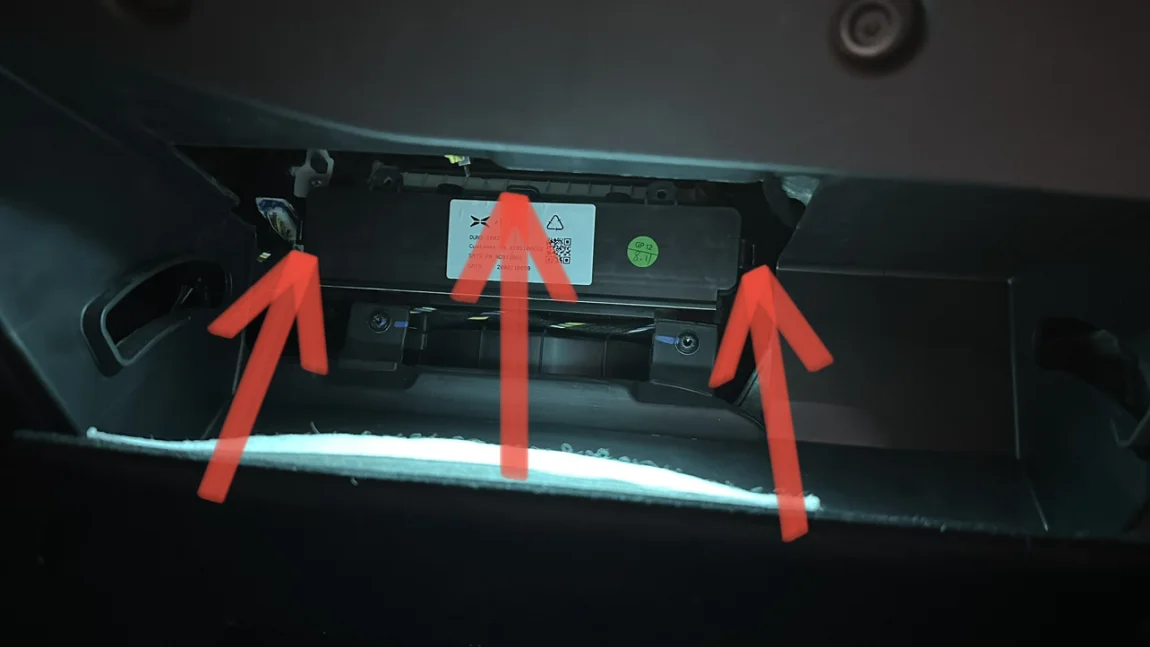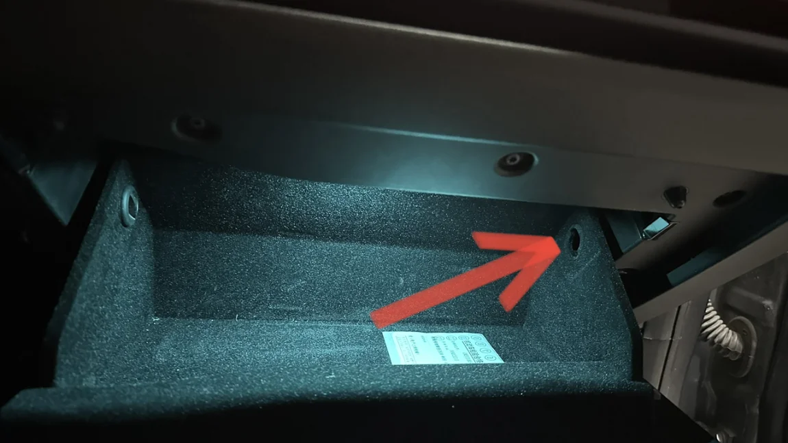 接下来打开手套箱,拆卸手套箱内部左右两侧塑料固定螺母(只需要旋转90度即可),将塑料螺母完全取出,如下图⬇️