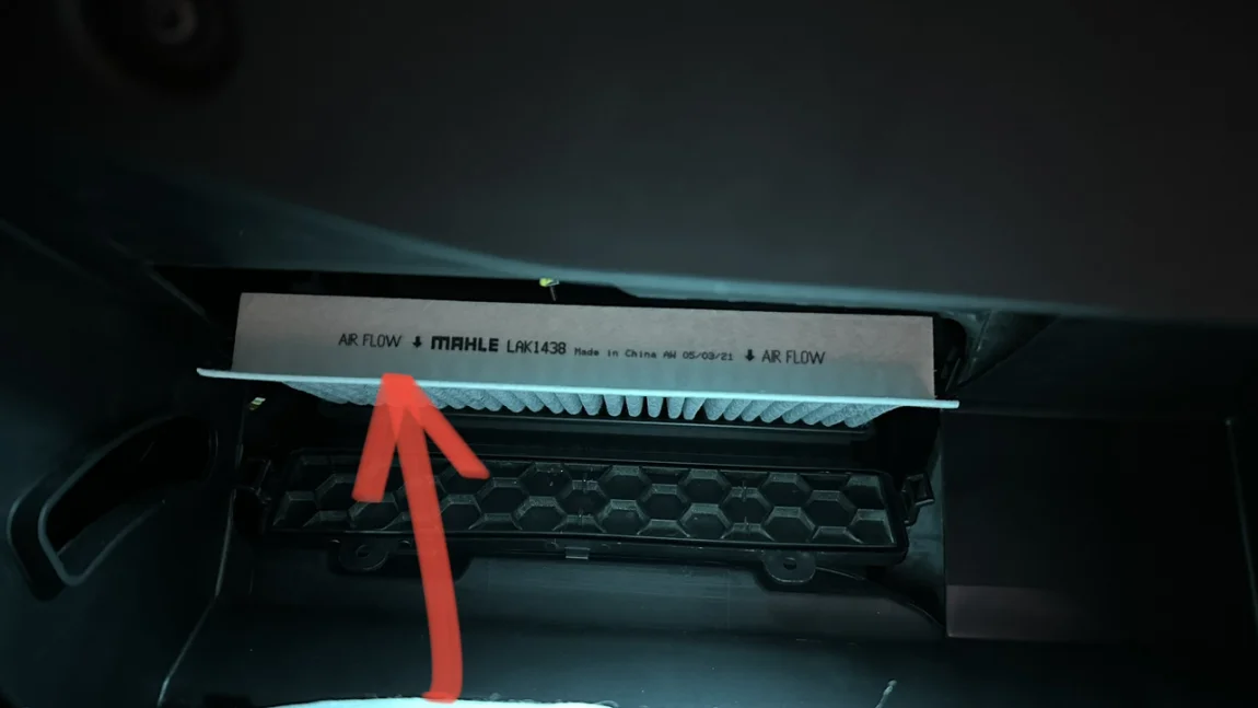 断开连杆后,手套箱就能最大限度的往下垂,留出上半部分操作空间,此时也能清晰的看到空调滤芯盖,松开盖两端的卡子和顶部的锁止卡扣,把盖板翻下来,即可取出滤芯