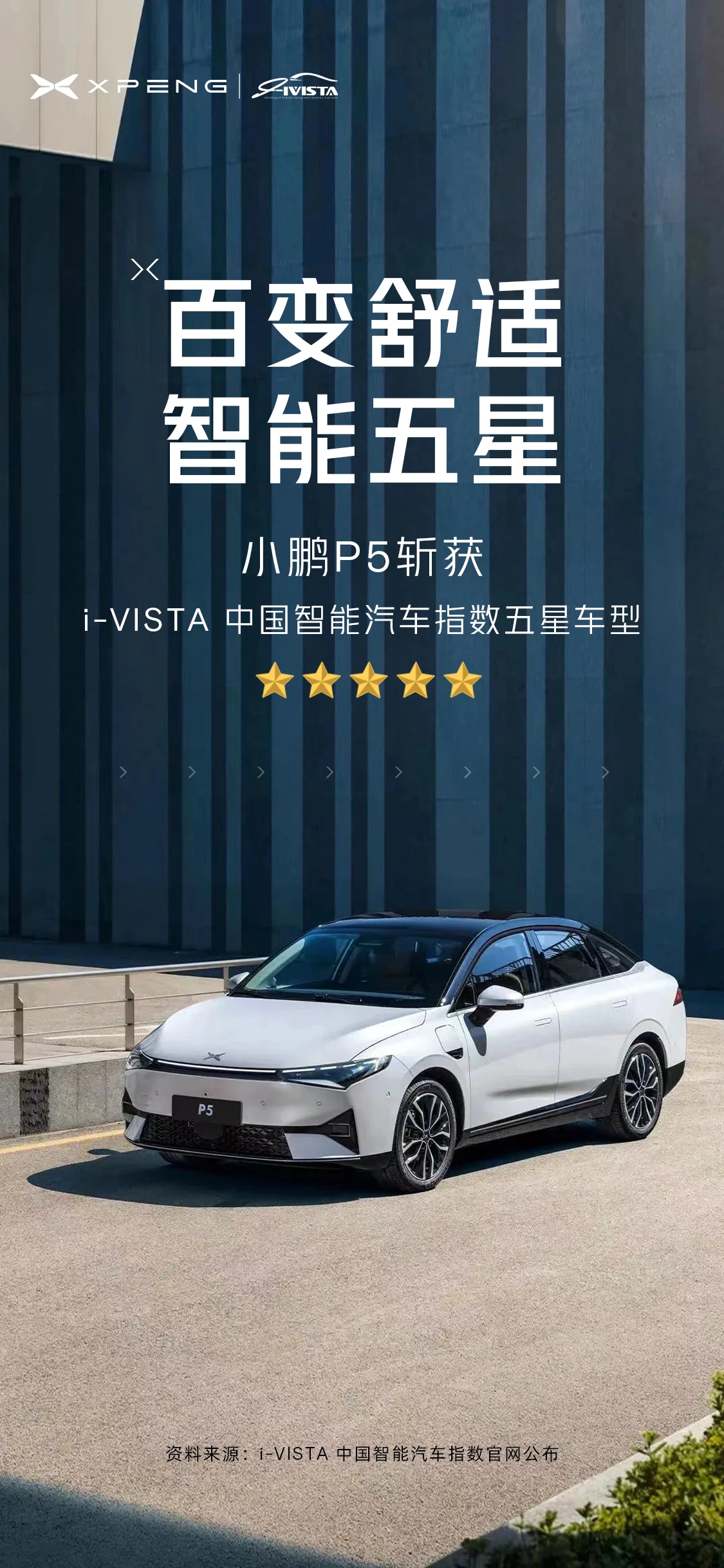 今日,i-VISTA智能汽车指数-2022年最新批次测试结果公布,小鹏P5继P7之后,成为小鹏汽车第二款斩获 i-VISTA智能五星的车型!!!🎈🎈