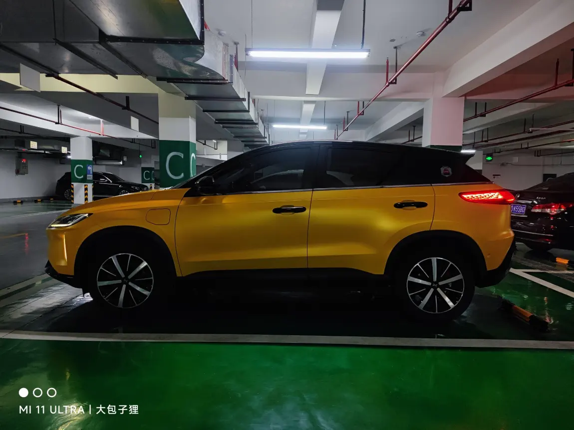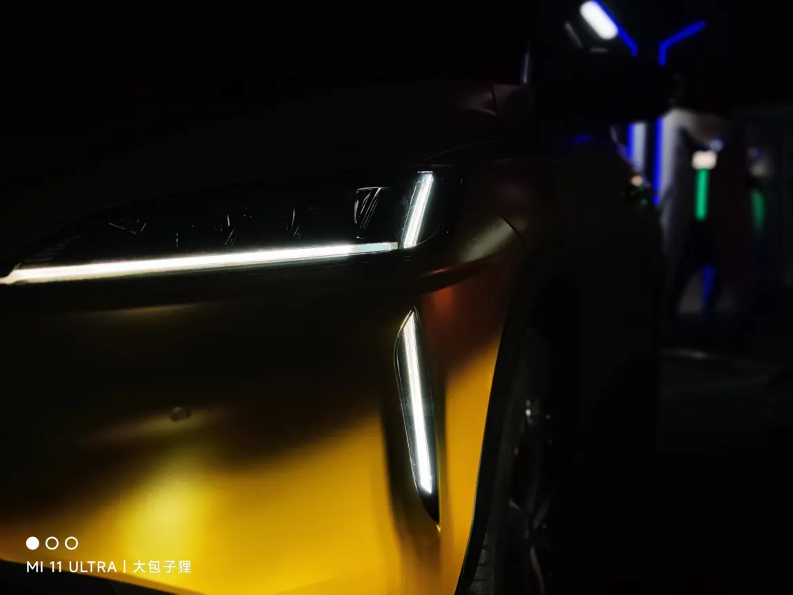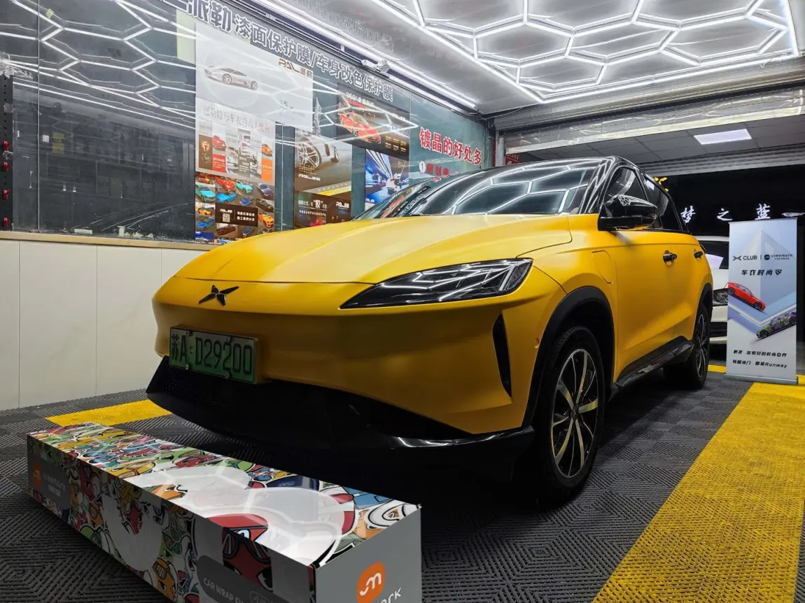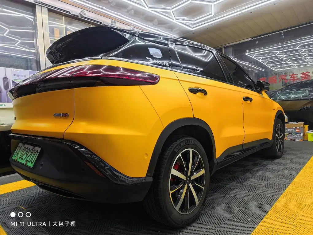 然后整个黄色的色系,并没有选择当下比较流行的变色膜系列,而是选择了纯色的金属黄,这种颜色略微有点偏向景色,而且还带有一点点磨砂,显得非常有质感,配合G3冲击力的车头,显得很有科技感和冲击感,无论是白天还是暗夜,都给人眼前一亮的感觉。