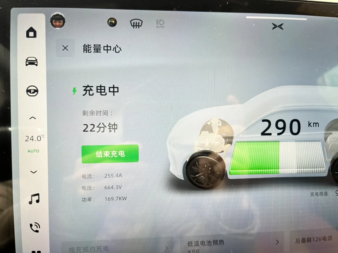 插上电枪,回到车内,打开车机大屏的充电信息页面,发现功率开始直线拉升,不一会就从80KW提升到170KW。我的乖乖,这还只是S2的快充桩啊,相比之前我的P7在这里最高功率只能跑到80+KW,这直接翻了一倍还多,确实太强了!