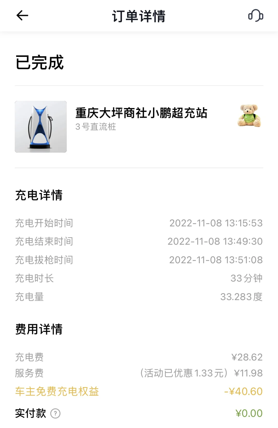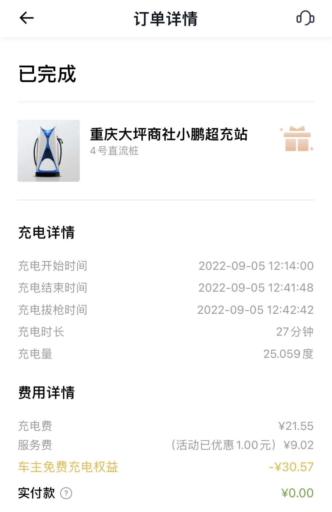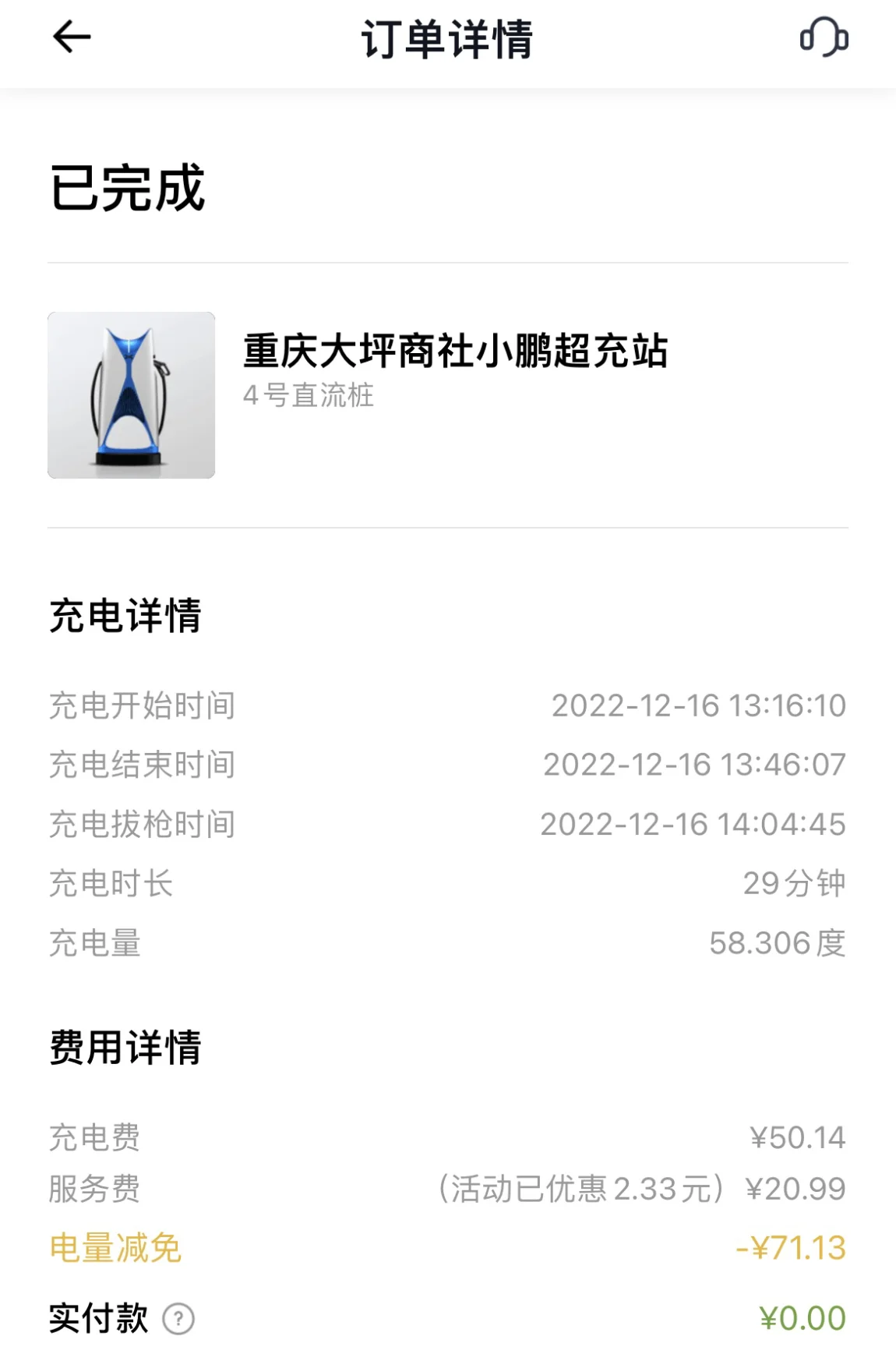 坐下来聊了一会天,手机就收到提示,已经充好电了,看了一下本次充电的数据:充电29分钟,充电电量58度。