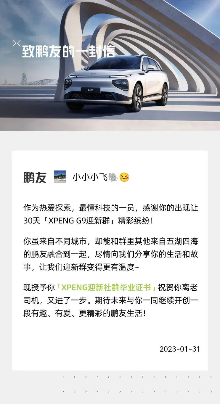 其次是客户关怀。以前我买的是合资车,可以说从车子开出4S店的那一刻起,他们的服务其实就中止了,也只有平时我出了险或者是好久没去保养,他们才会打个电话询问下。但是小鹏不一样,从提车后不久就由官方组建了鹏友群,不仅有来自五湖四海的鹏友交流用车体验,还有每日的学习和测试,现在每天不打卡我都很不适应。临近年前经销商还给提车用户赠送了新年礼包,包含精美小熊一只,这种感觉真是棒棒的。