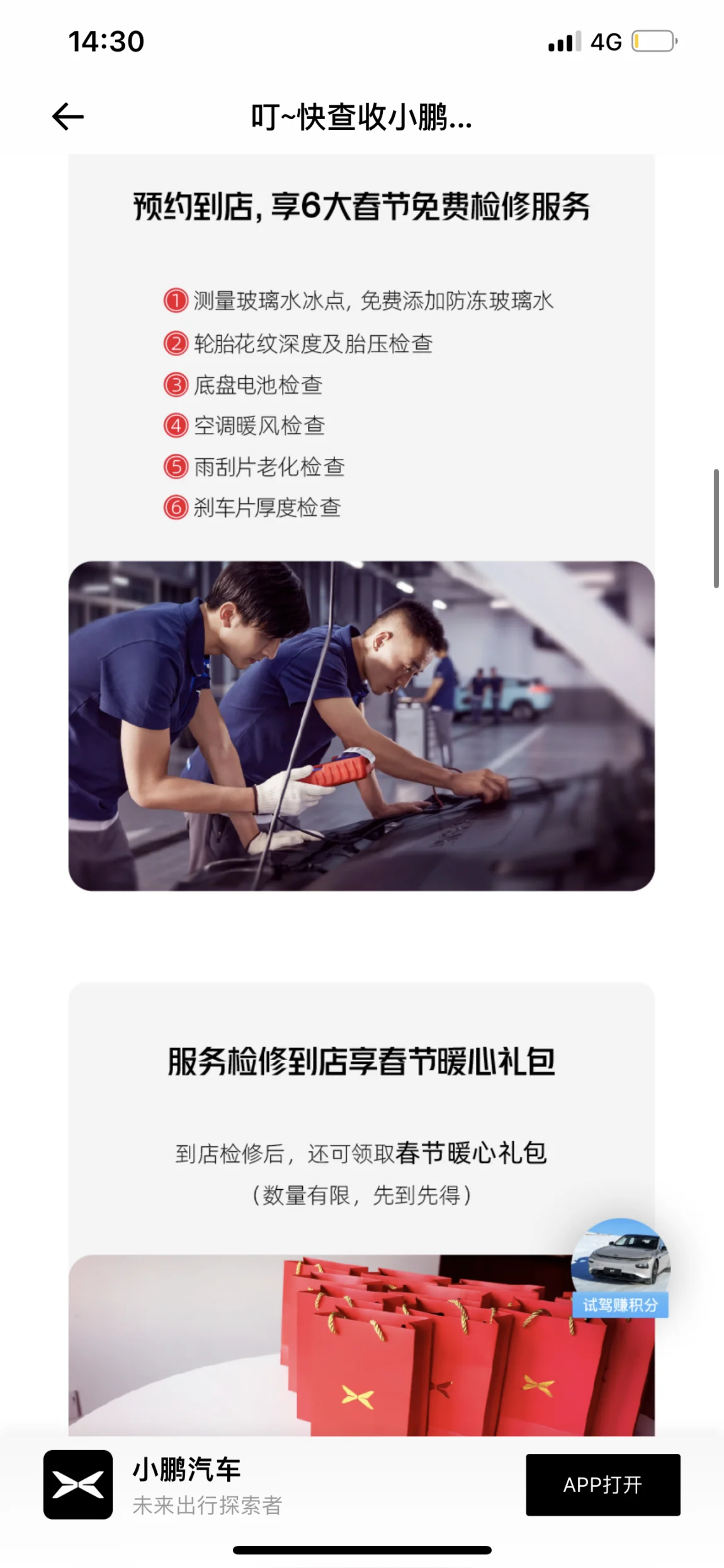 看到app推送暖心服务,就点进去瞧了瞧,一瞧惊喜就来了,六大免费检修服务。这必须得去,刚好适合春节前的出行检查,到店还有惊喜,送货暖心礼包,是抗原,口罩,酒精防疫用品,很适合现在放开后的现状。